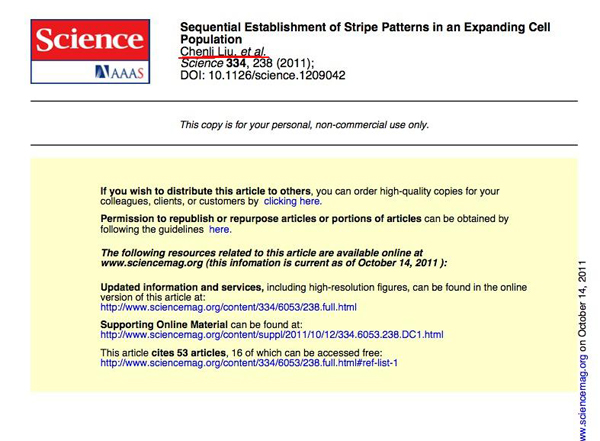 近日,国际顶尖学术期刊——《科学》(Science)刊登了我校校友刘陈立为第一作者、关于“发现新的生物图案生成原理”的研究成果(http://www.sciencemag.org/content/334/6053/238.full.pdf),解析了生物学上的一个根本性问题:细胞到底是如何通过自身的运动和成长,而形成美丽有序的形状的,这提出了调控细胞生长的一个全新生物学原理,对了解生物结构的形成机制具有重要意义。