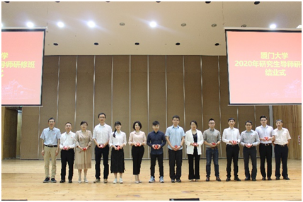 在11月7日上午的分学科研讨环节,人文学院王日根、管理学院徐迪、林伯强、知识产权研究院龙小宁、社会与人类学院胡荣、数学科学学院谭忠、化学化工学院谢素原、信息学院石江宏、航空航天学院侯亮、电子科学与技术学院陈忠、生命科学学院李勤喜、公共卫生学院张军等资深教授分享了他们在研究生培养过程中的经验体会。研究生院相关负责人围绕研究生培养方式、培养质量监控、导师招生资格确认、师生导学关系、因材施教、学术引领以及学科建设等问题与大家近距离、面对面交流,听取了来自一线导师的心声与感受。为进一步提高研讨的针对性,研究生院会前向各位新导师问卷征集对研究生指导感兴趣的问题及关心的培养政策。研修班结业典礼上,研究生院为参加培训的新任研究生导师代表颁发了研修结业证书和导师徽章。希望通过研修学习,新任导师尽快熟悉研究生教育的政策法规,了解研究生培养过程的各个环节,明确岗位职责,创新培养理念,提升指导能力,更好地承担起研究生培养引路人的责任,不断增强导师的使命感、责任感和荣誉感。