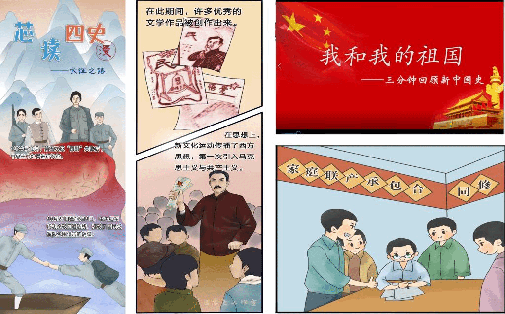 芯火工作室以漫画的形式生动展现了新文化运动、五四运动、红军长征、土地改革,回顾了那些波澜壮阔的岁月;芯辰工作室以图片的方式盘点了中国共产党近百年的标志性事件,讲述了中国共产党拯救国家与民族的历史担当;花生工作室用音频的方式创作了“守好制度才能留住根”“东方雄狮的苏醒时刻”“万里河山不足惧,长征会师显军魂”等作品,呈现了中国共产党领导中国走向欣欣向荣的“高光”时刻;厦至工作室用视频的方式创作了3分钟短视频“我和我的祖国”,展现了新中国成立、社会主义探索、改革开放等历史瞬间。通过丰富的网络文化作品,系统全面地展现中国共产党带领人民从“站起来、富起来、强起来”的辉煌历程,引领学生在学思践悟中坚定理想信念,在奋发有为中践行初心使命。