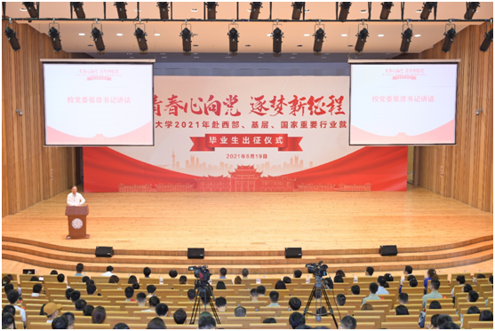 6月19日上午,我校2021年赴西部、基层、国家重要行业就业毕业生出征仪式在科学艺术中心举行,活动以“青春心向党•逐梦新征程”为主题,通过生动的形式、充实的内容、精心的组织打造一场别样的党史学习教育大课。校党委书记张彦、校党委副书记徐进功、中国人民解放军驻厦门大学后备军官选拔培训工作办公室主任王飞大校出席仪式。校学生工作部部长李峰主持仪式。