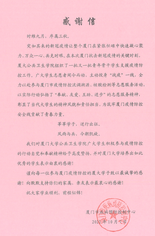 没有人生来勇敢,但疫情来临时,厦大公卫人挺身而出选择逆行,以实际行动彰显了当代大学生勇敢无畏、舍我其谁的精神面貌,为厦门疫情防控阻击战贡献了厦大智慧和青春力量。厦门市疾病预防控制中心用“舍身忘我,负重前行,健康所系,性命相托,献身医学,执着追求,同心战疫,感恩有你”来赞扬他们积极参与疫情防控的行动自觉和奉献精神。