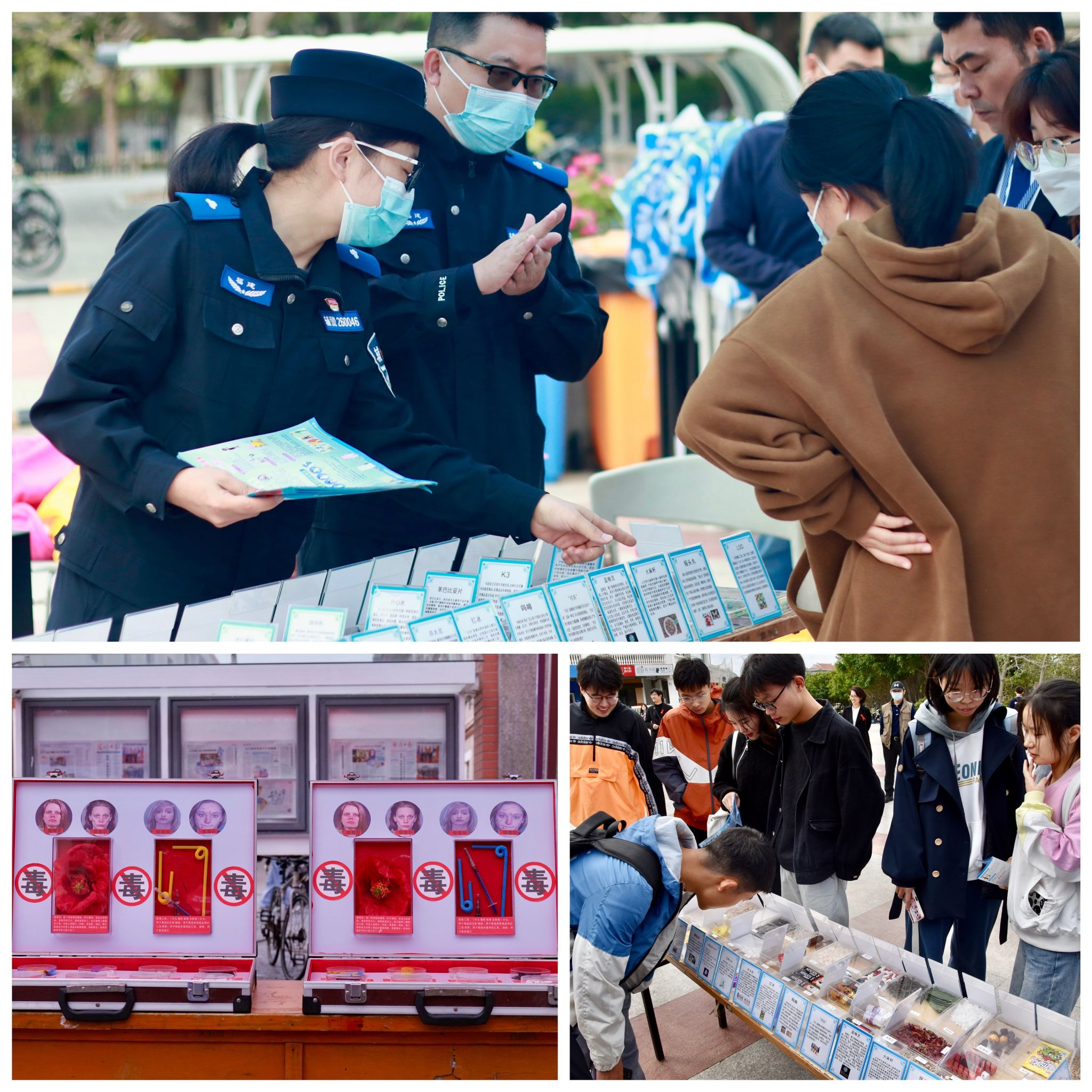 在思明校区三家村和翔安校区丰庭餐厅前广场,来自红丝带先锋党支部、公共卫生学院和艺术学院的志愿者们为参加活动的师生佩戴红丝带、发放宣传资料,引导大家参与有奖知识竞答和“防艾有我”签名活动。现场还展示了世界艾滋病日主题创意作品、禁毒知识宣传海报,安排了多款趣味小游戏,以寓教于乐的方式,帮助大学生加强对艾滋病防治和禁毒戒毒知识的了解。来自厦门大学医院和厦门大学附属翔安医院的医师们现场坐诊,为师生提供免费健康咨询、乙肝抗原义诊和皮肤科相关知识讲解。保卫处对40余种常见毒品进行实物展示和科普,倡导广大师生“远离毒品,健康生活”。