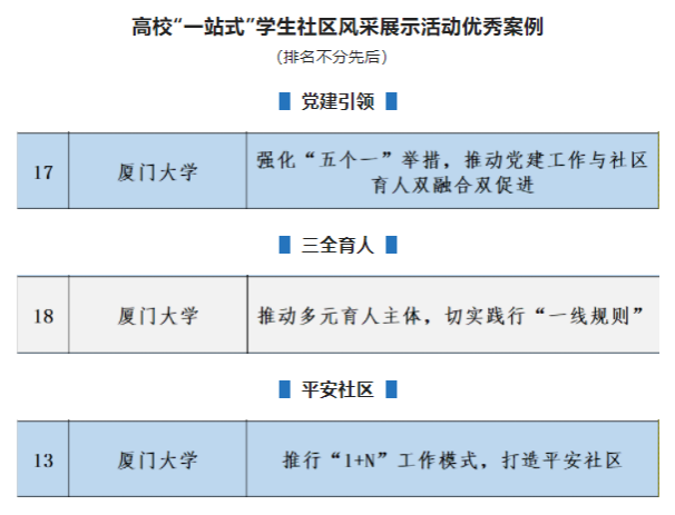 2019年10月,学校成功入选教育部首批“一站式”学生社区综合管理模式建设试点高校(全国共10所)。三年多来,学校紧紧围绕立德树人根本任务,坚持以习近平新时代中国特色社会主义思想为指引,立足多校区办学实际,围绕“党建引领、队伍入驻、学生参与、条件保障”等重点内容,持续深化“一站式”学生社区试点工作建设,不断拓展“三全育人”工作格局,提升学生社区育人实效,多篇试点改革新闻报道在教育部网站、高校思政网上刊发。同时,我校还于2021年出版《党建铸魂立德树人——厦门大学“一站式”学生社区综合管理模式建设》一书,全面、系统总结了我校自2017年以来的学生社区建设经验。