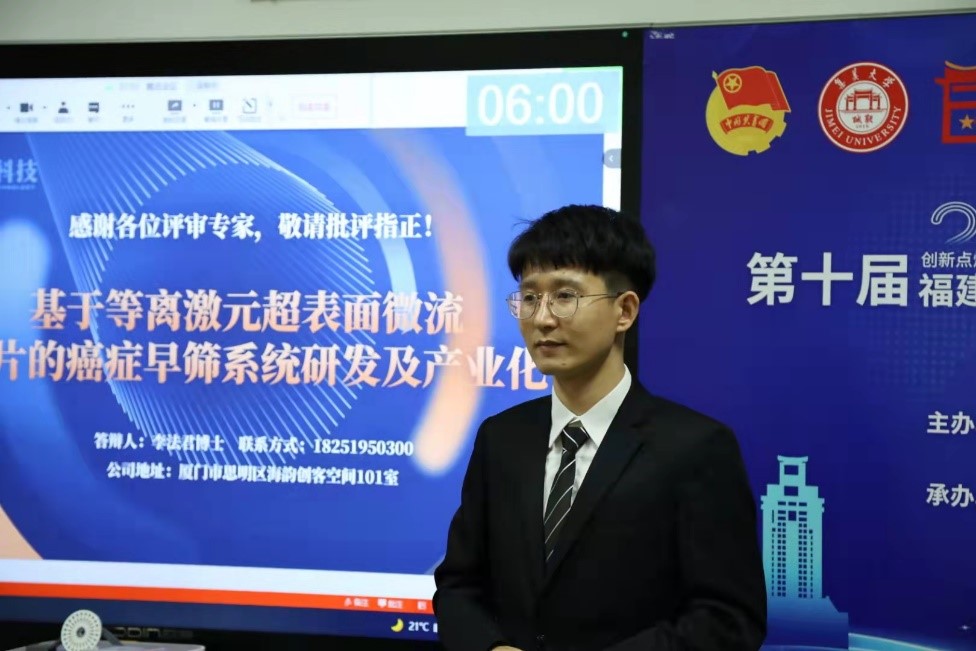 “基于等离激元超表面微流芯片的癌症早筛系统研发及产业化”项目由朱锦锋教授担任创业导师,由李法君博士带领厦门卓芯科技有限公司创业团队共同完成。该项目包括一体化微纳生物芯片、便携式全自动检测仪和手机APP,实现了基于超表面微流控检测系统的小型化、自动化和集成化。凭借良好的科学应用价值和社会推广意义,得到了国内外多为专家的推荐支持。此外,该项目还被德国科学新闻媒体Science Discoveries头版头条报道,曾代表福建省亮相第22届中国国际高交会和中国国际光博会。该项目自2020年8月实现产业化落地,已经和厦门大学附属第一医院开展深入合作,首批临床应用评价与用户满意度高。