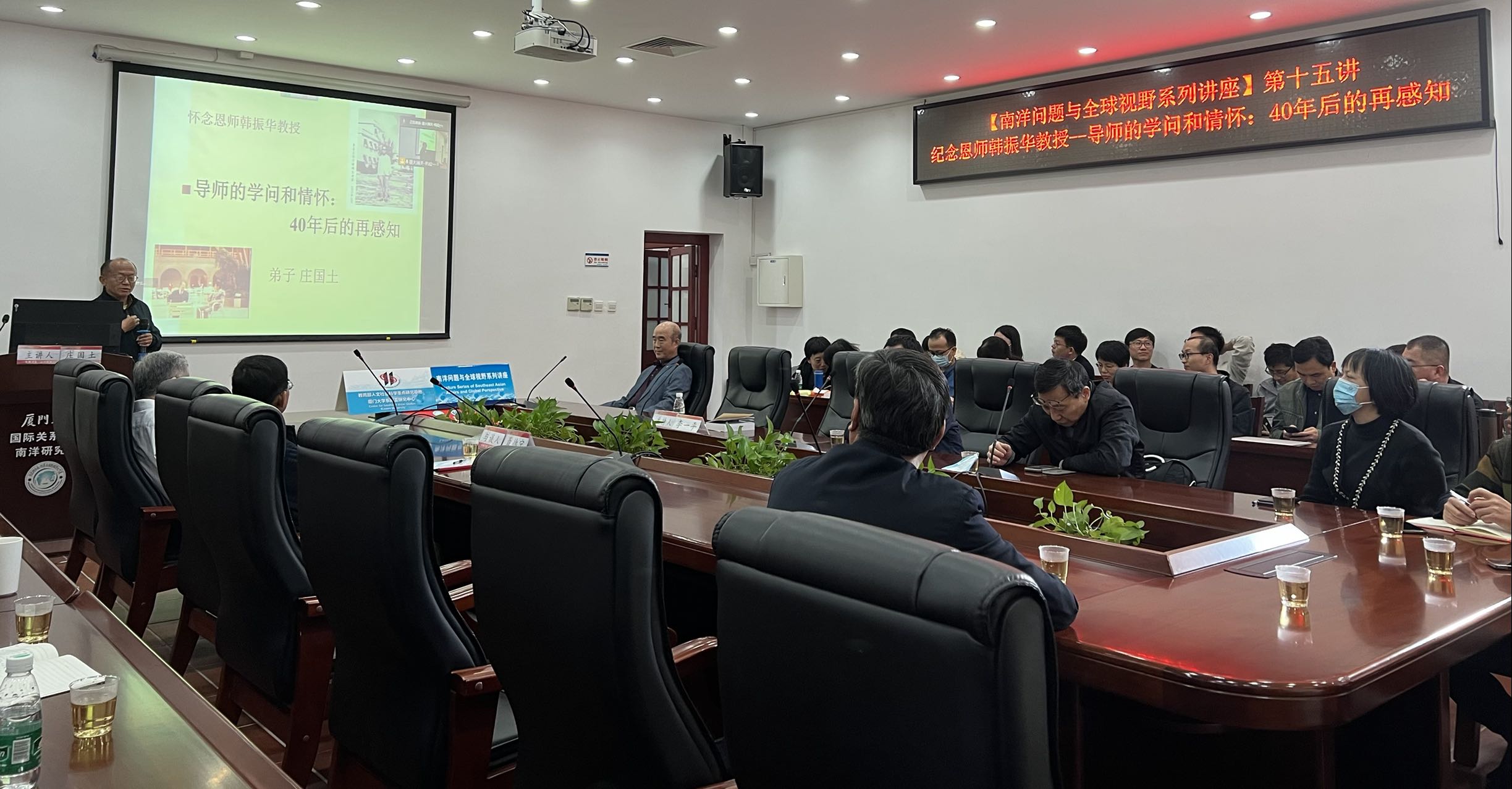 12月13日,“南洋问题与全球视野”系列讲座第十五讲“纪念恩师韩振华教授——导师的学问和情怀:40年后的再感知”在线上线下同步举办。本次讲座由厦门大学特聘教授庄国土主讲,国际关系学院/南洋研究院院长李一平主持。特邀原华侨大学校长、中国中外关系史学会前会长丘进来到讲座现场。