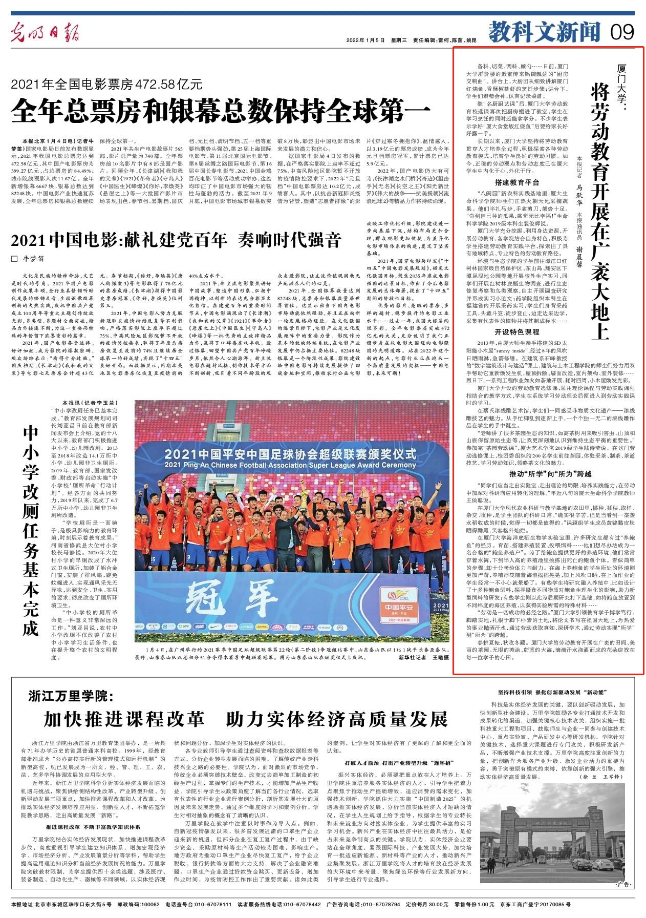 1月5日,《光明日报》第九版刊发深度通讯《厦门大学:将劳动教育开展在广袤大地上》,从搭建教育平台、开设特色课程、推动“所学”向“所为”跨越三个层次报道我校坚持将劳动教育贯穿人才培养全过程,积极探索各种劳动教育模式。