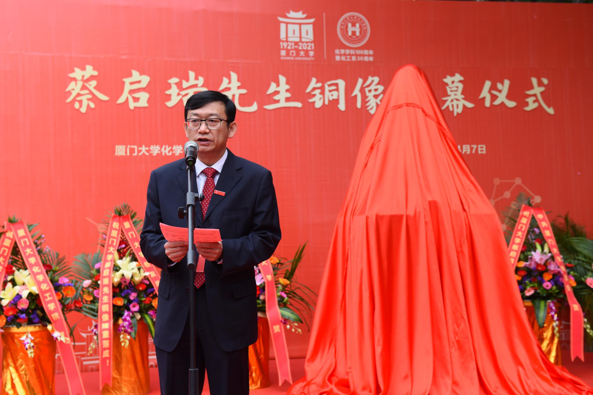 铜像捐建单位代表马永健先生在致辞中提到蔡启瑞院士为人师表,治学严谨,勇于创新,待人谦和,淡泊名利,一心为公,恪守学术规范、坚守学术诚信,为中国培养出一大批科技人才,是科学工作者的前辈和楷模,令人敬仰。在建党百年之际,“十四五”开局之年,厦门大学和厦门大学化学学科也迎来了百岁华诞。走过百年路,踏上新征程,他希望厦门大学与厦门大学化学化工学院继往开来,砥砺前行,再创辉煌!