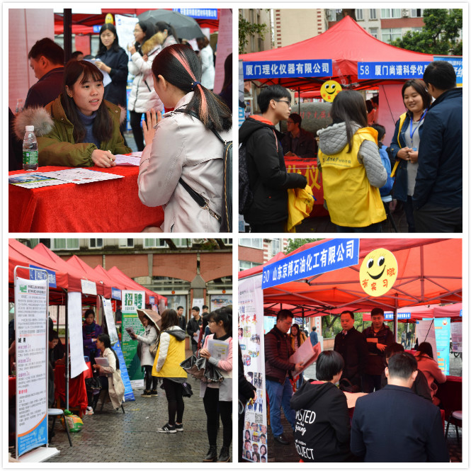 3月10号上午,由化学化工学院和材料学院联合主办的“厦门大学化学、化工、材料及其相关专业2017年毕业生就业暨2018届实习见习专场招聘会”在三家村学生广场及自钦楼一楼展厅举行。化学化工学院院长江云宝,党委副书记李芬芬、刘俊杰,材料学院党委副书记庄曦以及两个学院的学工组辅导员等悉数到场,并与招聘企业、应聘学生进行交流。