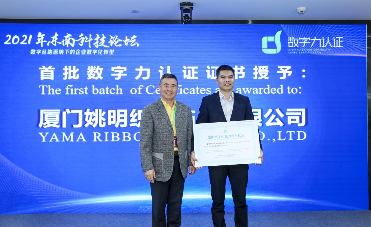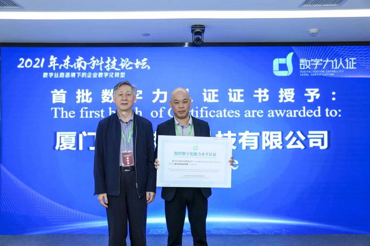 本次论坛还发布 “数字化能力水平认证”,数字化能力水平认证(简称,数字力认证,或DCLC),由全国高等学校计算机教育研究会主办、厦门数字孪生信息科技有限公司承办,面向社会,用于考查个人的数字素养与技能、数据科学知识以及组织的数字化转型能力的全国性认证体系。数字力认证围绕提升个人的数字力,研发推出人才数字力(DCI)认证;以组织数字化转型的生命周期模型为基础,研发推出组织数字力(DCO)认证。全国高等学校计算机教育研究会理事长何炎祥教授、副理事长李茂青教授分别向厦门姚明织带饰品有限公司、厦门长江电子科技有限公司颁发首批数字力认证证书。