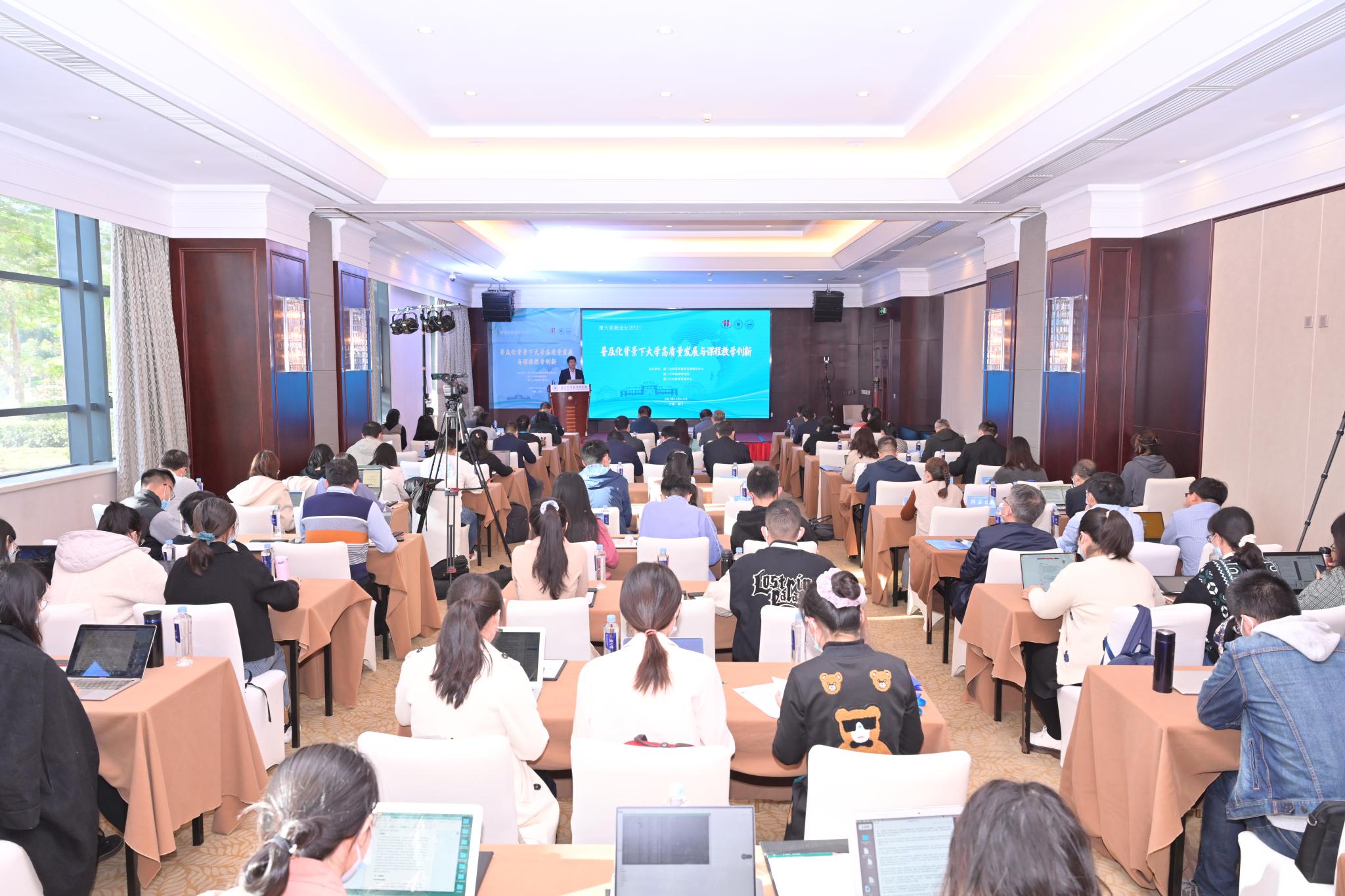 本次论坛除厦门主会场外,还通过全程视频会议形式进行网络互动直播,各界专家学者齐聚一堂,共话高等教育改革与发展。论坛围绕“高等教育普及化发展与高质量高等教育体系建设”“大学高质量发展与创新人才培养”“翻转课堂与混合式教学的理论与实践”“信息技术深度融合大学教育教学”“‘四新’学科建设的理论与实践”“应用性课程与教学创新的理论和实践”等议题分享交流理论研究成果与实践探索经验,进一步推动普及化背景下人才培养、课程和教学改革创新。