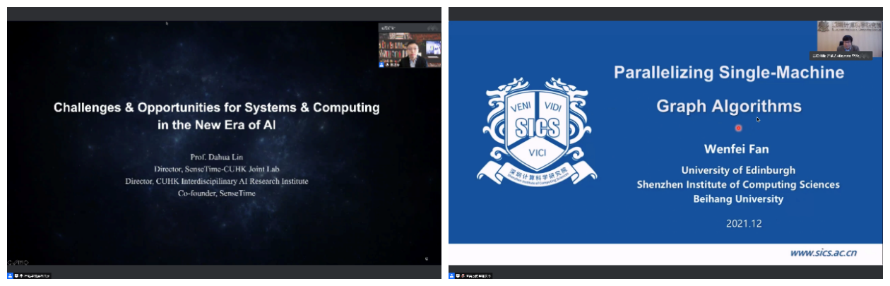 研讨会以特邀报告、论文报告、座谈会形式开展。在特邀报告环节,商汤科技联合创始人林达华教授介绍了人工智能新时代对系统研究的机遇和挑战,深入浅出地剖析了二者之间所存在的紧密联系和未来的发展可能。爱丁堡大学的樊文飞院士介绍了单机图算法的并行化研究,从并行系统和并行算法两个角度对该问题展开了深入的探索。卡塔尔计算研究所主任科学家马晓松教授分享了如何将图系统或分布式存储中大量的随机访问或数据放置转换为顺序的或有序的存贮及使用的有趣观察和方法。湖南大学校长助理、信息科学与工程学院院长李肯立教授介绍了面向高效能图神经网络的算法与体系结构协同设计。华为MindSpore首席架构师金雪锋部长结合华为开源的AI框架MindSpore的实践,探讨了AI框架的技术演进之路。清华大学计算机系翟季冬副教授探讨了在当前以及下一代高性能计算机上,如何开展异构高性能计算机编程模型和优化。论文报告环节,与会讲者分别就存储系统、深度学习框架、人工智能与系统的结合、矩阵计算、微服务和Serverless、以及机器学习系统、测试与安全等多个主题进行了论文的分享,引发了广泛的技术讨论。座谈会环节,陈海波教授、王肇国副教授、包云岗研究员、翟季冬副教授和华为的金雪锋部长回顾了前十年中国计算机系统研究所经历的巨大发展,也讨论了对未来十年中国计算机研究的期待。