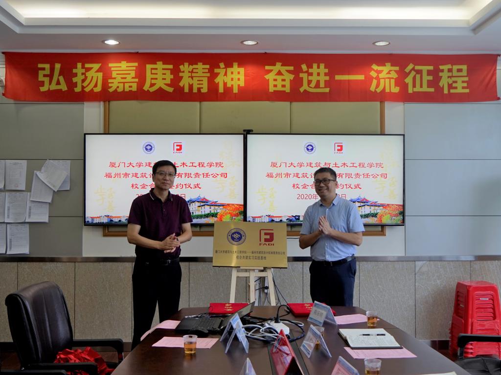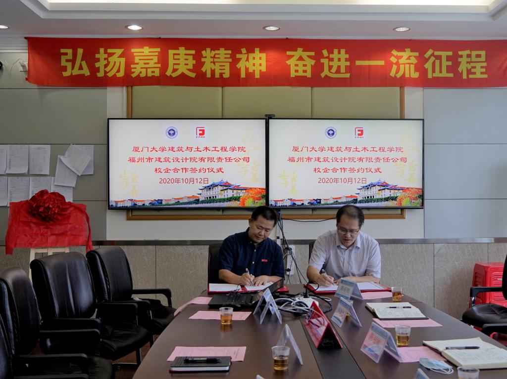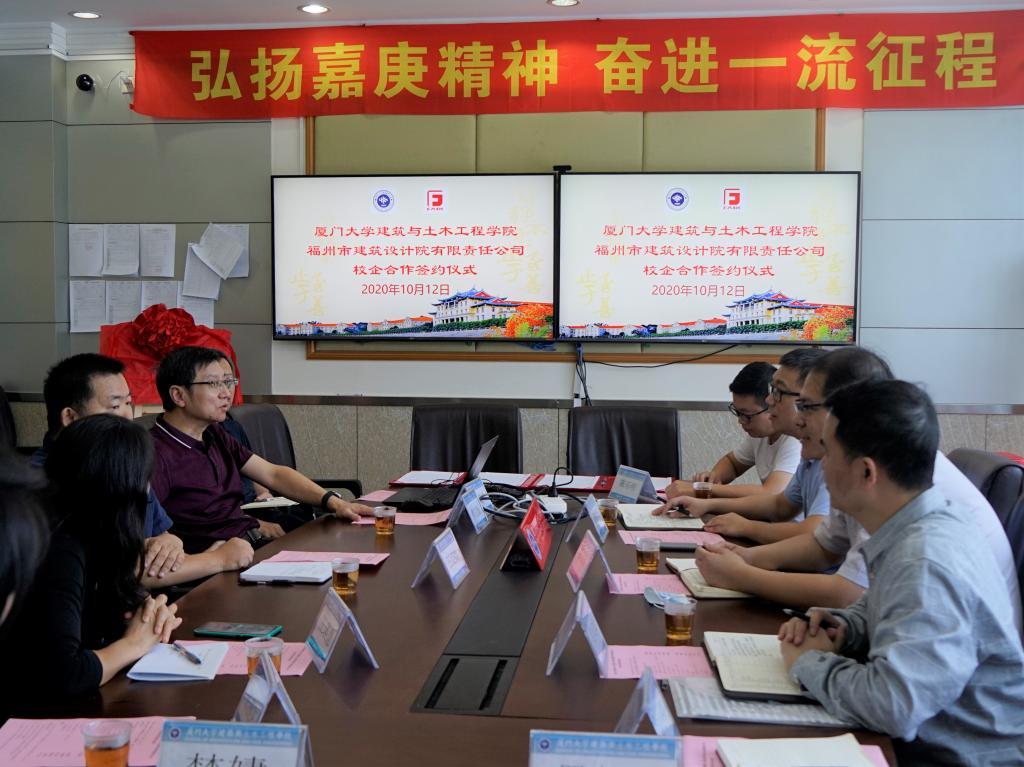 10月12日下午,厦门大学建筑与土木工程学院与福州市建筑设计院有限责任公司校企合作签约仪式在曾呈奎楼208会议室举行,双方将共建学生实习基地,建立资深导师机制,开展科研项目合作。