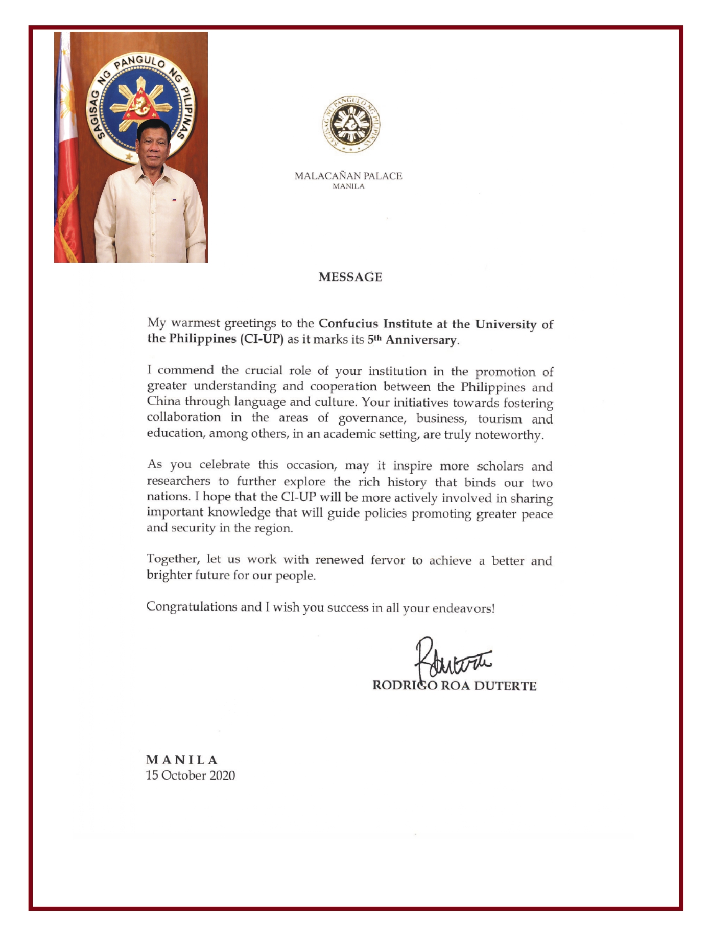 杜特尔特总统在信中表示,“值此五周年盛事,我衷心期望它能激励更多专家学者投身该事业,将历史渊源深厚的中菲两国更加紧密地联系在一起。我亦期待未来贵孔院能更加积极主动为区域和平治理分享经验与智慧,为不断完善区域和平与安全决策贡献更大力量。”中菲两国一衣带水,文化交流交融源远流长。我们相信,在未来路上,菲律宾大学孔子学院还将行稳致远,继续为两国人民的友谊和发展做出更大贡献。
