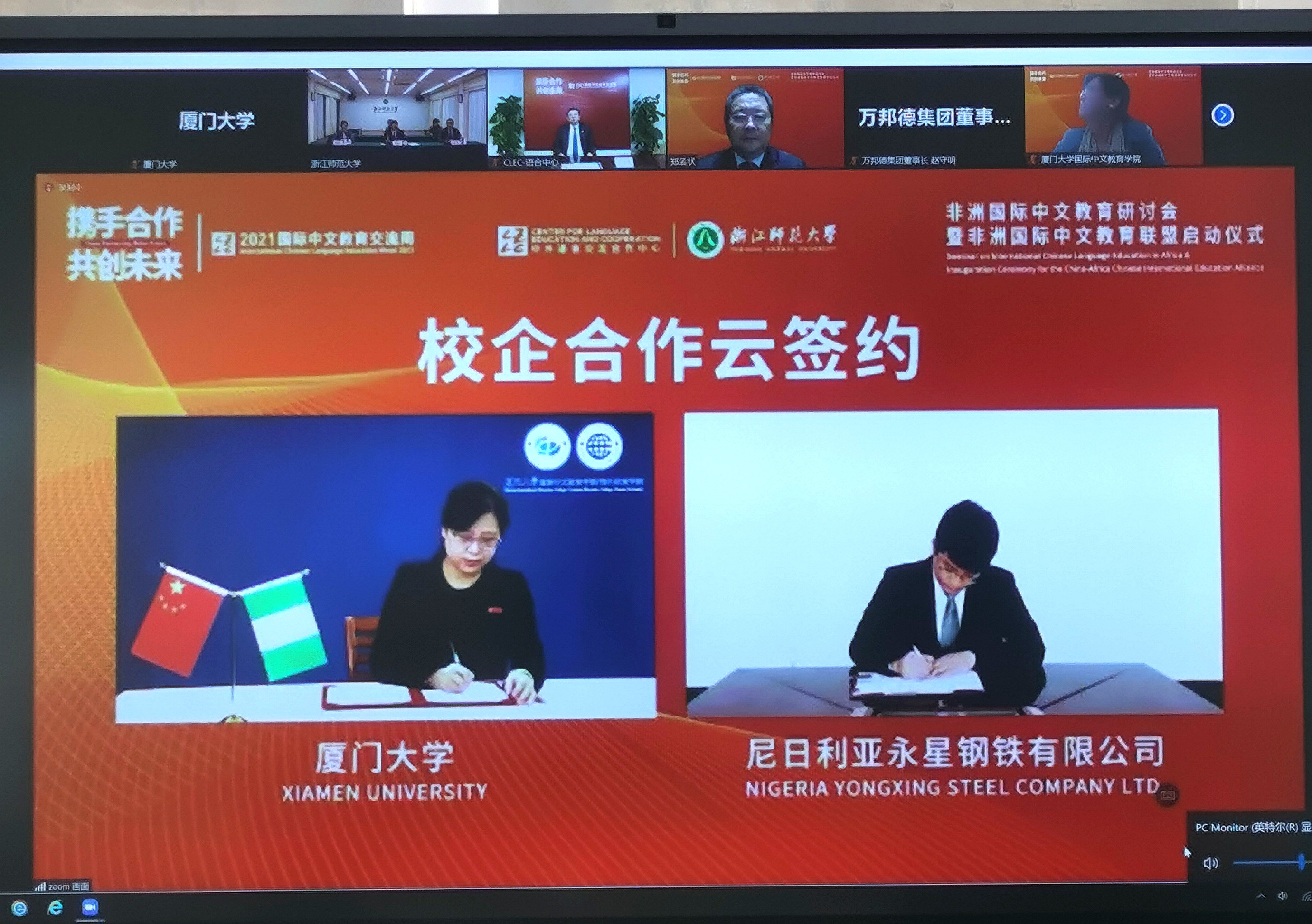 非洲国际中文教育联盟由浙师大牵头,中非高等院校、职业院校、企业和行业协会等64家单位共同发起。我校作为首批发起单位,在启动仪式上与尼日利亚永星钢铁有限公司“云端”签订合作框架协议,以进一步推动我校国际中文教育与职业教育“走出去”融合发展。