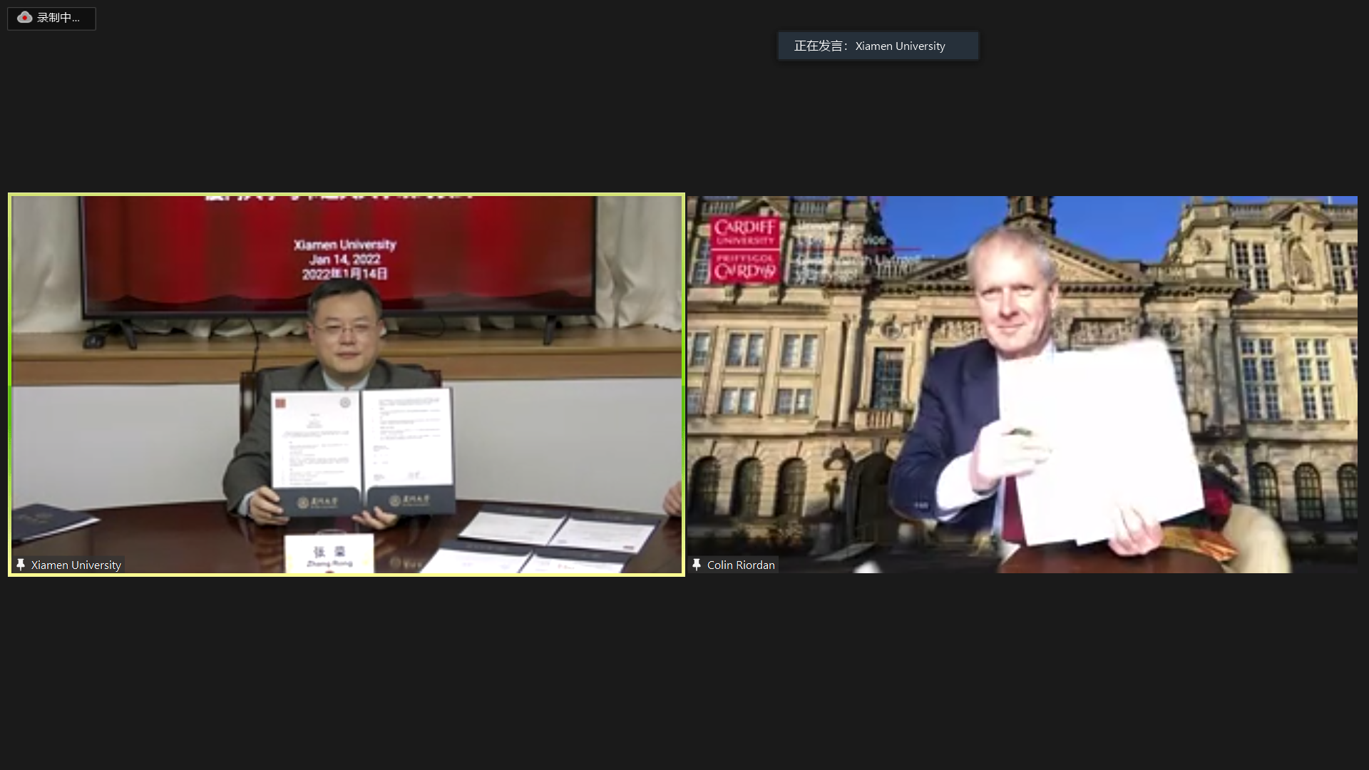 1月14日,学校与英国卡迪夫大学举行线上仪式,续签《战略伙伴关系协议》及《师生交流种子基金协议》。厦门大学校长张荣与卡迪夫大学校长科林·赖尔登共同签署协议并致辞。