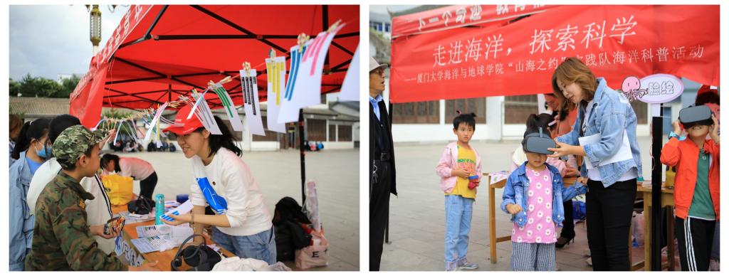 实践队由学院党委副书记郑碧娇、海洋生物系工程师杨位迪指导,团委书记陈启妍带队,包括本硕博9名海洋学子共同参与。海洋文化创意空间以传播海洋科学文化为主题,集科普、阅读、创意手工、探索实践等功能于一体,涵盖了海洋科普长廊、DIY创意手工坊、图书屋、仿真海洋沙池、海洋生物标本展示、LED视频教学等六大功能区。海洋科普长廊第一期主题包括海洋面积与海底地形介绍、认识海水与海洋生物、海洋污染现状、海洋科学探索史、厦门大学海洋学科史等内容,科普主题及内容将定期更新。半封闭式图书屋最大存书量约为1400本(目前已有图书1000余本),分为海洋专区、科学专区、冒险专区、文学专区、传统专区、绘本专区、学习资料区等,同时配备书桌、长凳和小沙发。DIY创意手工坊配备了折纸拼图、益智游戏、卡通绘画、涂色贝壳画和风铃制作设计等诸多手工制作材料,旨在培养学生的动手能力,启发其创造力,配套的桌椅可灵活摆放,满足不同活动的需求。仿真设计的海洋沙滩池,由钢化玻璃缸和景观沙布置,摆放生物模型和蛟龙号船模,通过造景直观展示潮间带及不同深度的海洋世界,加入生物模型摆放和互动游戏,增加学生对生物在海洋中分布的认识。海洋标本展示区呈现的是柯才焕教授和丁少雄教授慷慨捐赠的珍贵标本,包括海马、贝类等海洋生物标本,以及厦门大学“嘉庚”号海洋科考船模型等。LED显示屏则搭载了网络视频在线课堂系统,不仅囊括了丰富的视频教学资源,同时支持线上远程教学指导,可实现与当地的互动,保证教育资源的持续输送。