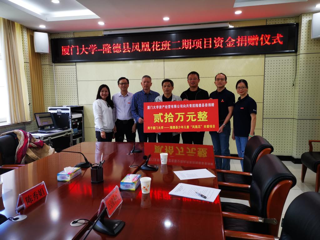 郑建华说,厦门大学深刻学习领会习近平总书记关于扶贫开发工作的系列重要讲话精神,高度重视定点扶贫工作。自与宁夏隆德县建立定点扶贫结对关系以来,学校就以高度的政治责任感和使命感,用“实”的精神和态度,不断创新工作思路,丰富智力扶贫模式,动员各方力量,广泛凝聚脱贫攻坚强大合力,按照“隆德所需,厦大所能”的原则,紧紧围绕隆德县经济社会发展急需项目开展帮扶。资产经营有限公司响应学校号召,认真组织了扶贫工作方案,就推动学校科技成果转移转化、发挥成员企业优势助力当地产业脱贫以及发挥“科创梦工场”创新转化平台的教育培训优势,协助当地进行创新创业、成果转化等各类培训方面进行了积极的探讨和组织。同时,为协助促进隆德县深度贫困地区和特殊贫困群体的留守儿童以及随迁子女素质全面发展,组织公司本部和成员企业共同捐款20万元,用于隆德县少年儿童“凤凰花”班系列活动,希望在谋求企业发展的同时,付出应尽的社会责任和义务,为隆德当地办点实实在在的事。资产经营有限公司将以本次活动作为契机,继续通过实际行动,关注隆德当地的发展、关注隆德少年儿童们的健康成长,与大家一起努力,为隆德当地的建设发展贡献自己的力量。