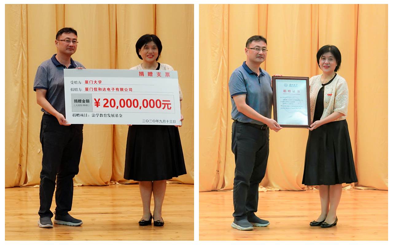 9月13日上午,法学院在科学艺术中心报告厅举行厦门信和达电子有限公司捐赠签约仪式。仪式上,厦门信和达电子有限公司向法学院捐赠2000万元教育发展基金,作为厦门大学法学院建设和发展之用。副校长邱伟杰,厦门信和达电子有限公司董事长、法学院1990级院友黄健,学校教育发展基金会秘书长曾云声、副秘书长赵晓慧,法学院党委书记许和山、院长宋方青,法学院党政领导和教师代表出席仪式。法学院2020级全体新生参加仪式。仪式由法学院党委书记许和山主持。