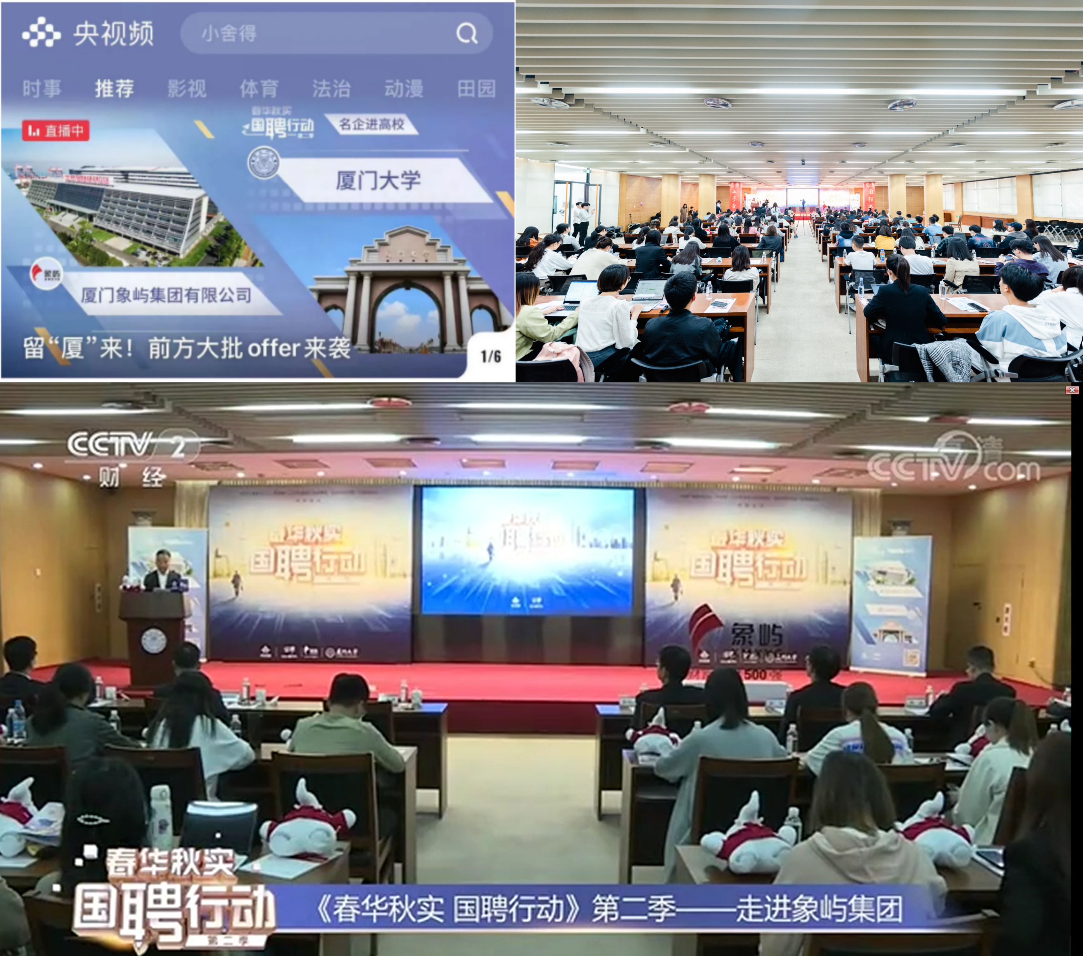 4月15日下午,由中央广播电视总台携手教育部、人社部、国资委、团中央共同发起,央视频与国投人力共同主办的“国聘行动”第二季——“春华秋实·国聘行动”大型融媒体招聘活动“象屿集团走进厦门大学”在科学艺术中心一楼多功能厅举行。活动由央视主持人赵志瑾主持,并在线上同步直播。厦门大学党委副书记徐进功,学生工作处副处长高斌出席活动。200余名厦大学子参加线下宣讲会,数万名网友通过央视频APP收看直播,央视财经频道也对活动进行专题报道。