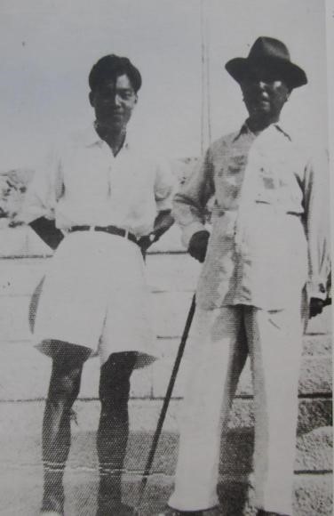 1950年代,陈嘉庚先生(右)与建筑部主任陈永定先生在厦大建设工地上合影