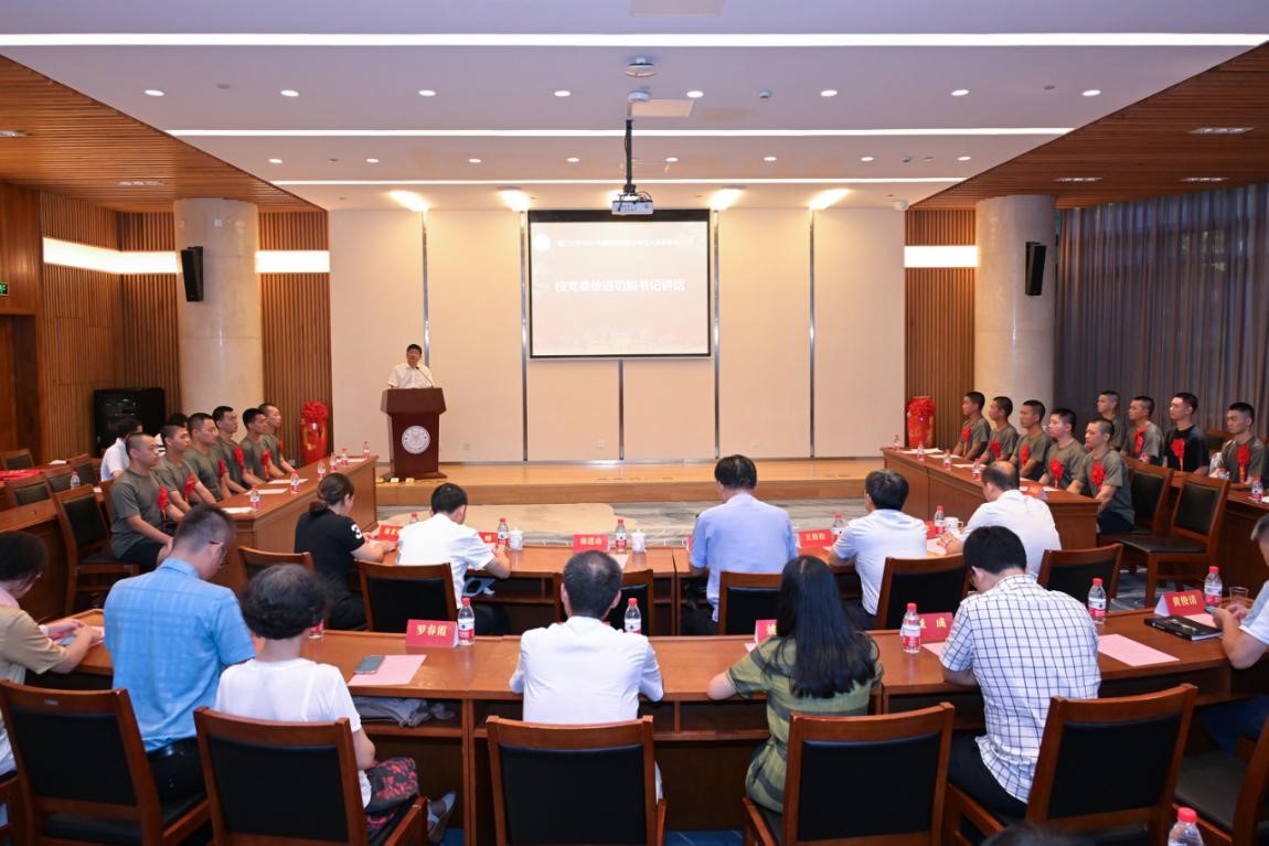 徐进功代表学校党委对积极应征入伍的新兵表示祝贺。他说,今年是中国共产党建党100周年,经过全党全国各族人民持续奋斗,我们如期在中华大地上全面建成了小康社会,并向第二个百年奋斗目标迈进。厦门大学与党同龄,在党的旗帜引领下,与党同心,同向同行,烙下浓墨重彩的红色印记。百年来,厦大人践行使命,用不懈的奋斗铸就忠诚,用实干的姿态创造价值,为祖国的建设和发展做出巨大贡献。他希望,新兵们志存高远、奋发图强,勇于吃苦担当,主动磨砺意志,在军队舞台上主动施展才华,为实现“强国梦”“强军梦”贡献青春和力量。各学院各部门要提高政治站位,弘扬拥军优属光荣传统,加强人文关怀,帮助新兵有效解除后顾之忧。