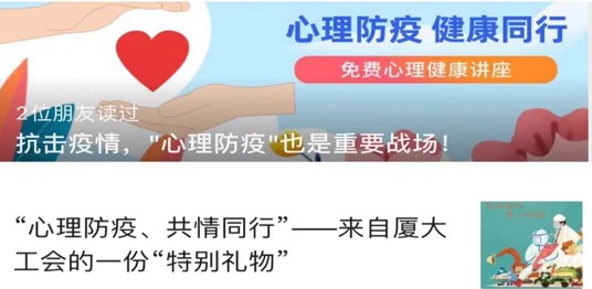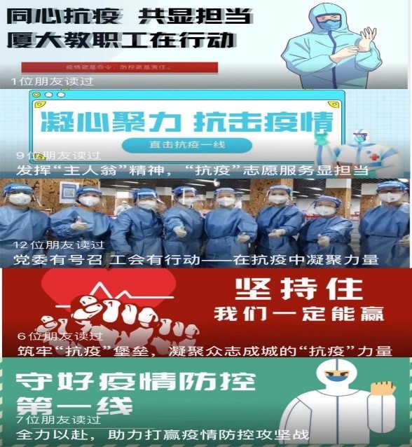 弘扬抗疫精神,传播正能量。为了记录厦大人的抗疫经历,留存住这一份特殊的集体记忆,校工会通过微信公众号发出征集厦大人抗疫故事的通知,各基层部门工会积极投稿,讲述在防控疫情、教学科研、服务保障、居家防护等方面的抗“疫”故事。校工会分别以“凝心聚力 抗击疫情”为题共推出五期基层抗疫专栏,展现厦大教职工团结一心、同舟共济的精神风貌,推送受到广大教职工的好评,总阅读量达3千余次。