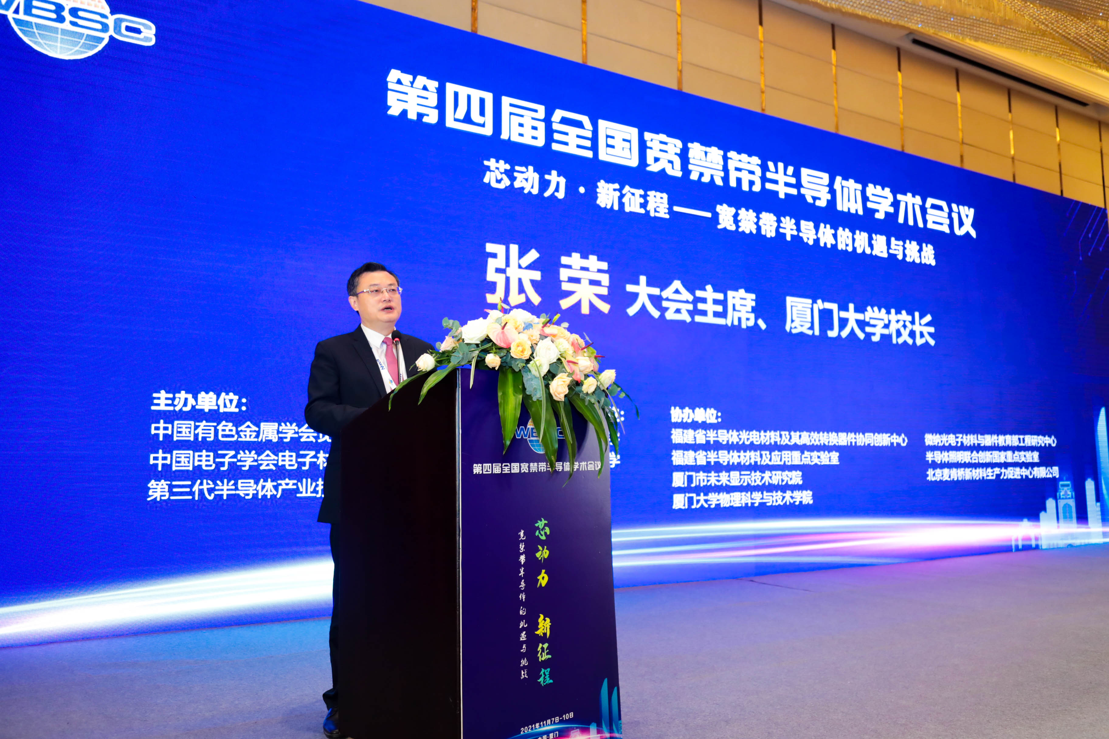 张荣首先代表学校欢迎来自全国各地高校、科研院所及企业等近150家单位的500余位参会嘉宾。他表示,厦门大学是国内最早创办半导体学科的五所高校之一,在政府和产业的支持下,先后建成厦门第一条半导体器件研发工艺线;建立了中国第一个半导体照明产业化基地。近年来,厦门大学与三安光电、光莆电子、乾照光电等企业联合攻关,在宽禁带半导体固态照明光源、大功率可见光激光器、柔性多结太阳能电池及深紫外消杀等领域深入合作并取得新进展,持续推动宽禁带半导体的成果转化和技术创新。面对日益激烈的国际竞争,厦大将进一步加强与各科研机构、产业企业合作,坚持“四个面向”,针对关键问题和“卡脖子”问题下大力气,为国家科技战略力量提升输送更多高层次、创新型科技人才,为推动国家创新战略的实施作出更大贡献。