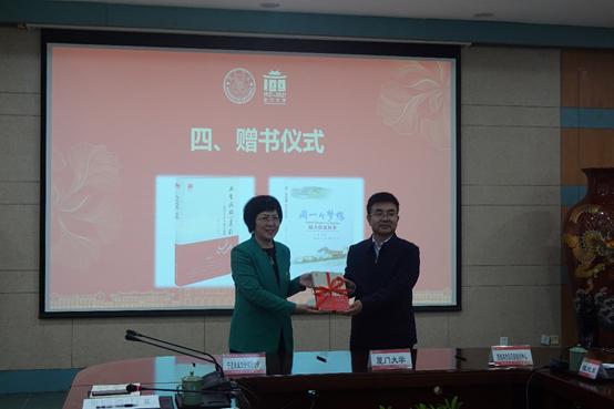邓朝晖代表学校将书籍《为吾国放一异彩——厦门大学与伟大祖国》和《同一个梦想——厦大扶贫故事》赠与隆德县委,表达了推进定点帮扶的美好展望。