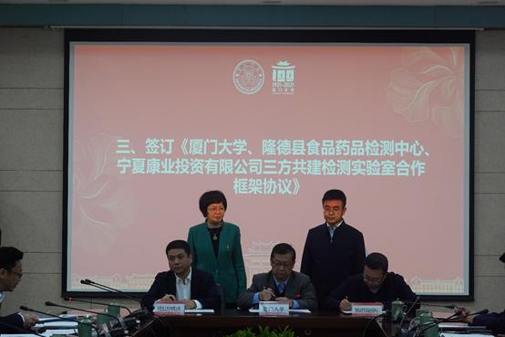 在前期充分沟通协商下,我校与隆德县食品药品检测中心、宁夏康业投资有限公司决定共建检测实验室,全力保障隆德食品药品安全。座谈会上,举行了三方签约仪式。