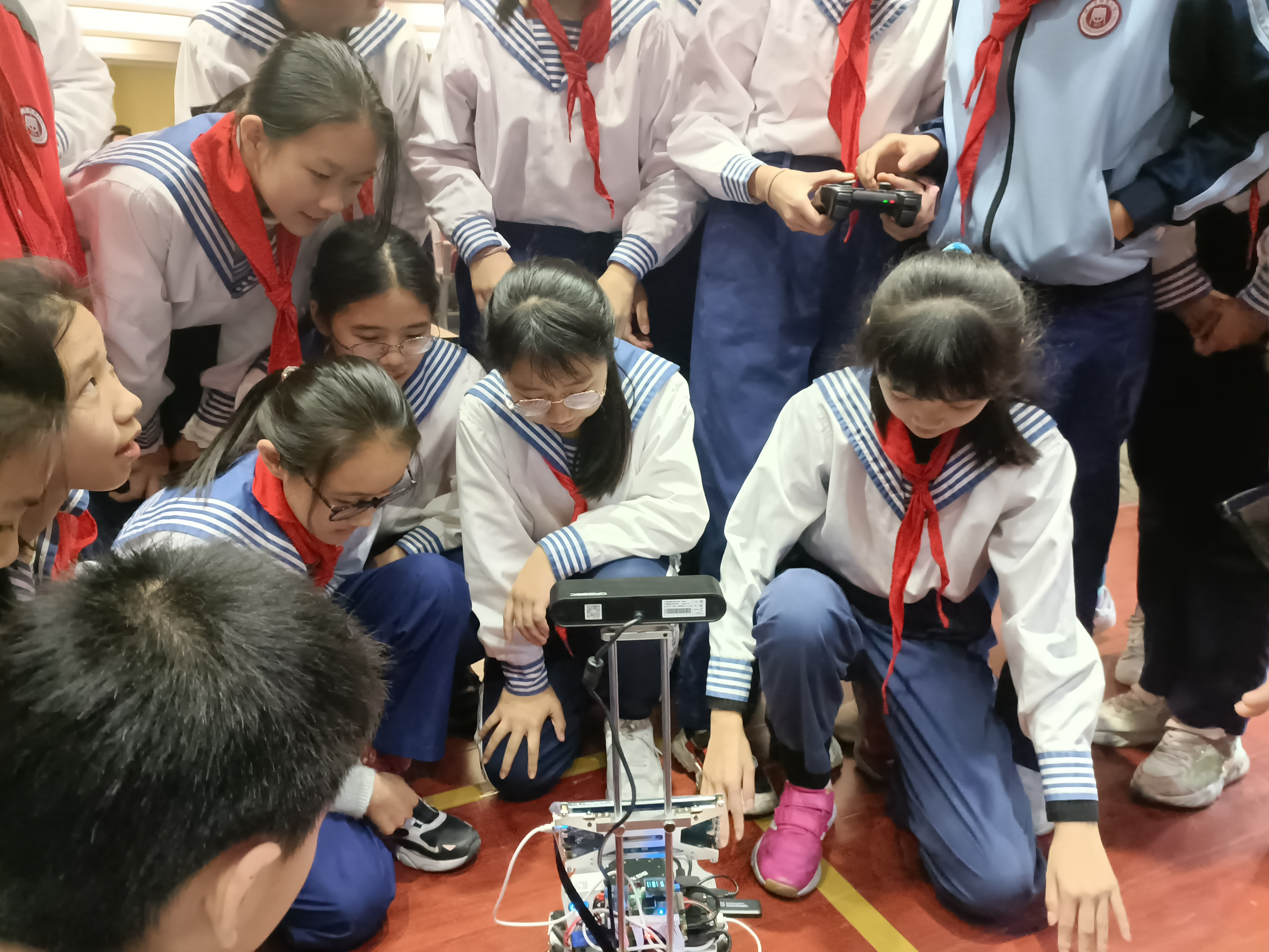 随后,导览机器人在群惠小学科技节上精彩亮相,把现场氛围推向高潮。学生们在厦大老师和志愿者们的指导下,操作导览机器人和超声波避障智能小车,了解机器人原理,感受到科学的魅力。