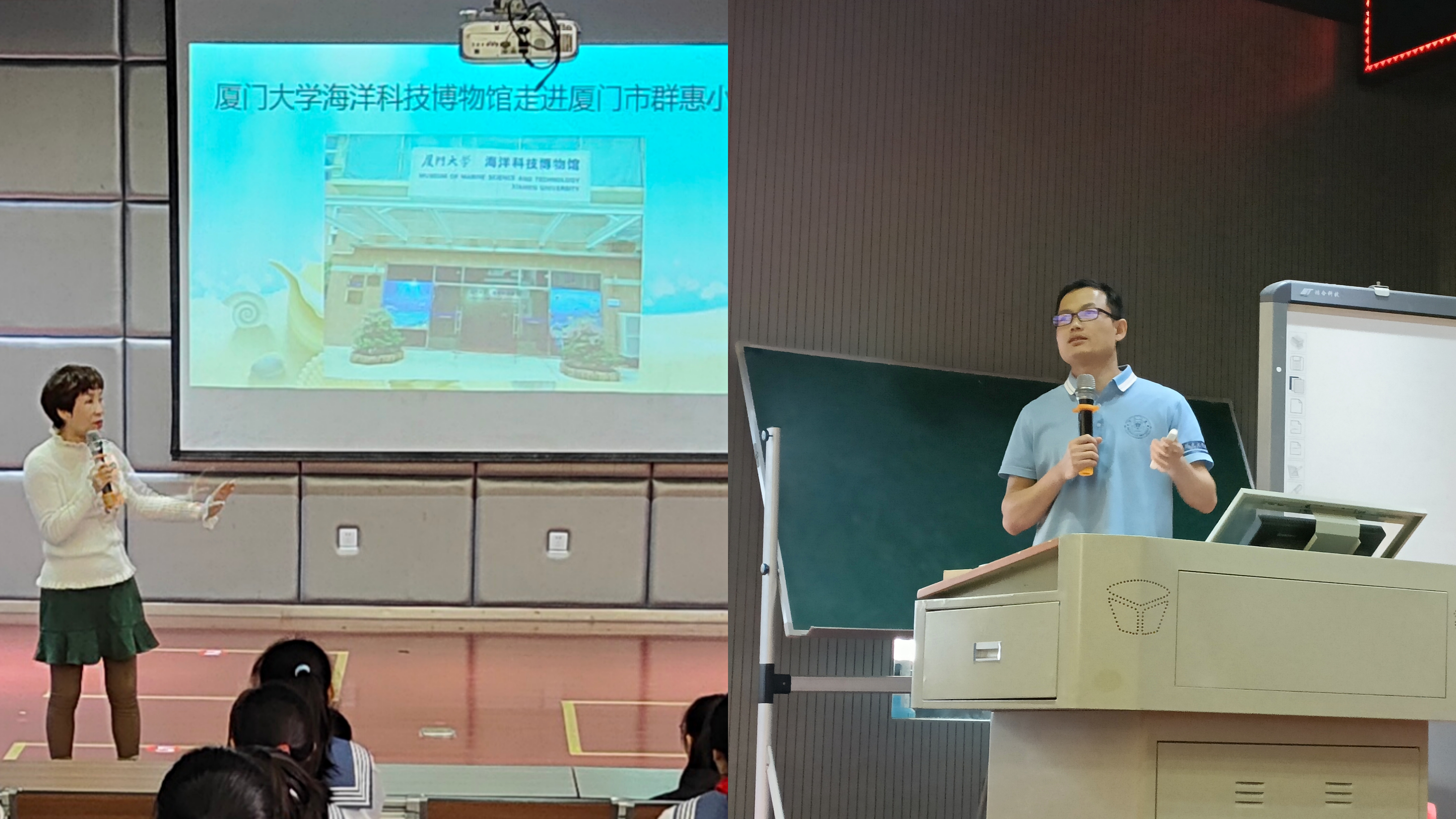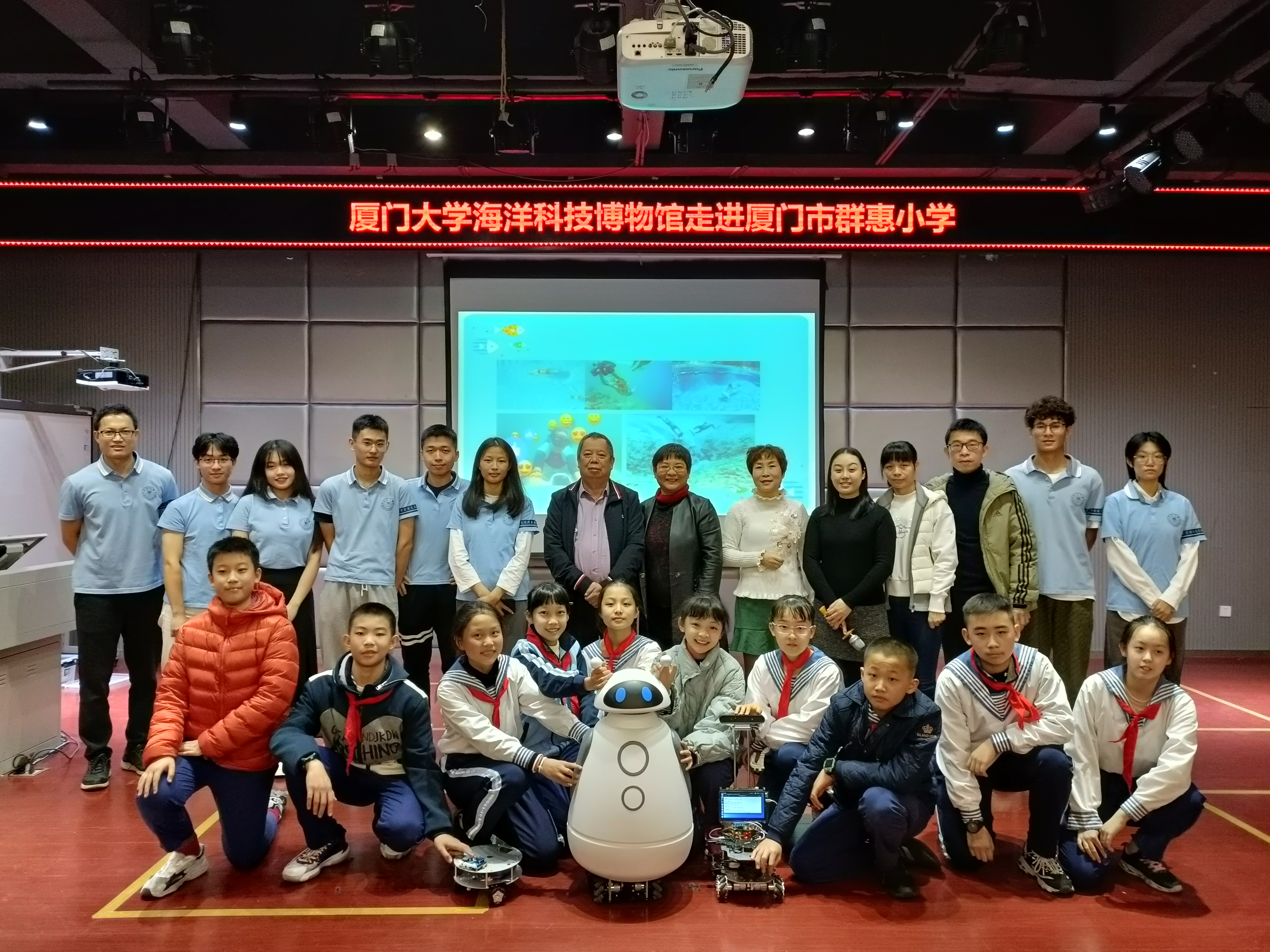 2021年12月28日下午, “探索海洋AI,聆听大海之声”海洋科技博物馆(以下简称博物馆)精准互动探究型主题科普实践活动走进思明区群惠小学。此项活动由海洋与地球学院张朝霞、陈东升老师主讲,由厦大海洋科技博物馆海洋科普志愿者团队辅助开展,包括科普课堂、知识问答、VR体验、机器人发布等丰富环节。在本次科普活动中,博物馆联合厦门大学学生创新创业团队自主研发的导览机器人(以下简称“导览机器人”)重磅发布,受到群惠小学师生们的热烈欢迎。