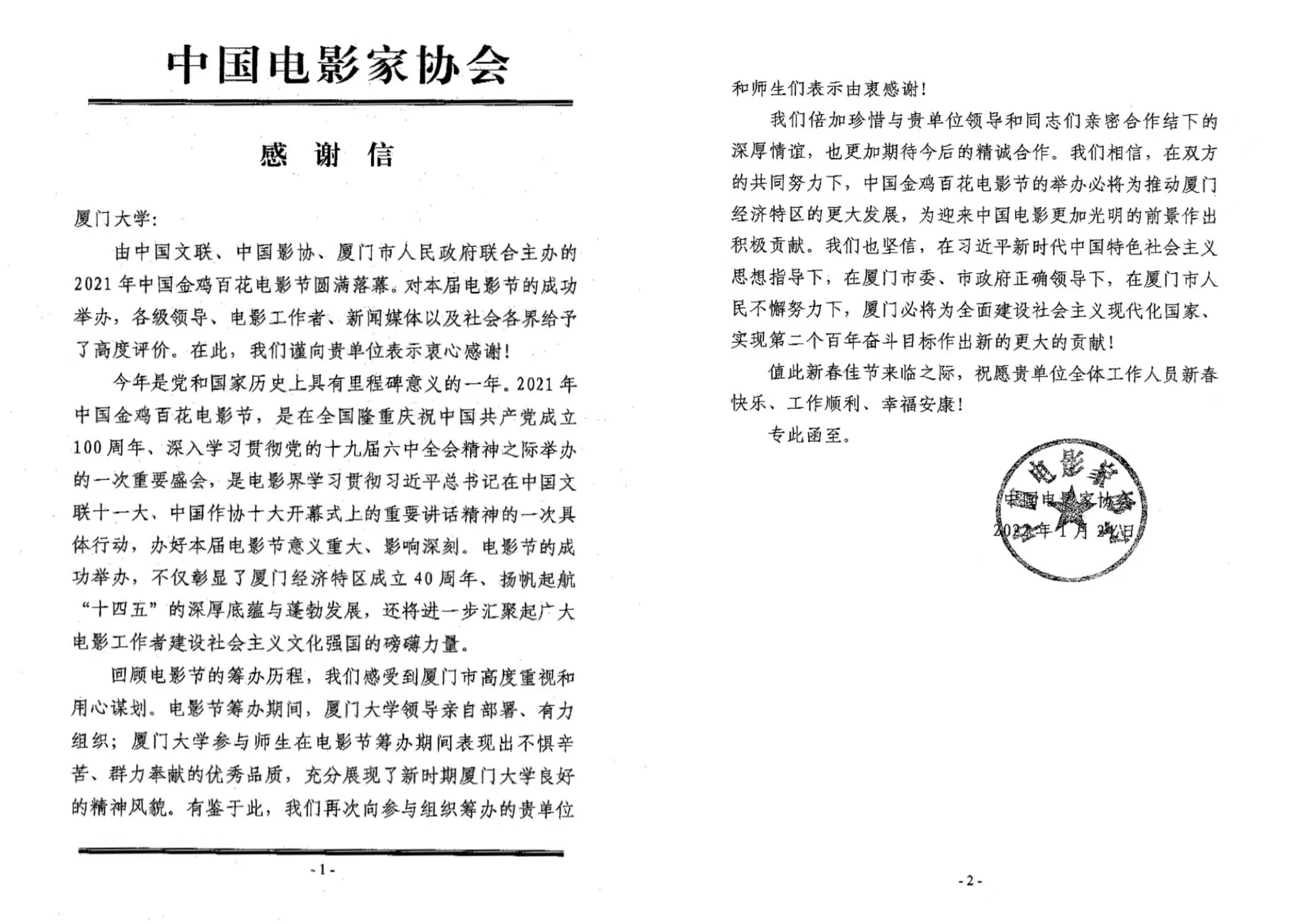 近日,中国电影家协会发来感谢信,向我校师生在2021年中国金鸡百花电影节的有力组织与群力奉献表示感谢。