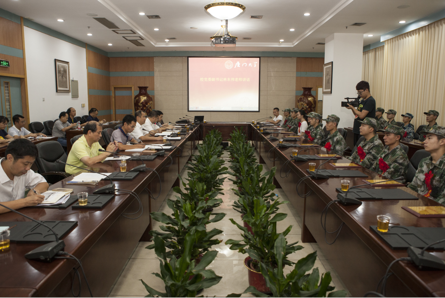 林东伟代表学校党委对积极应征入伍的新兵表示祝贺。他表示,自2002年被列为福建省在校征集大学生入伍试点单位以来,我校学生参军积极性不断高涨,他们在部队都成为各类优秀士兵的模范,树立起厦大学子应有的风采。他希望入伍大学生牢记“国无防不立”要有胸怀天下的精神品质,把个人理想融入到“强军梦”、“强国梦”、“中国梦”的实际行动中;要牢记“百炼方能成钢”, 作为厦大学子,在军营要锻造铮铮铁骨、锤炼意志品格,要处处当表率、作模范,把厦大的四种精神,通过身体力行,融入到部队的一点一滴中去;要牢记厦大永远是你们最温暖的家,学校将努力为大家创造良好条件,让应征大学生没有后顾之忧,安心在部队建功立业。