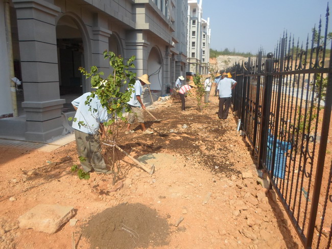 不断攀升的气温抵不过翔安校区二期绿化建设的热潮。连续半个多月以来,绿化工作的一线员工们不辞劳苦地工作着。他们分布于各个种植点,填土挖坑、铺草皮、种树支架、浇水灌溉,汗水湿透了他们的衣背,但是很快,他们的汗水也将浇灌出校园新面貌。