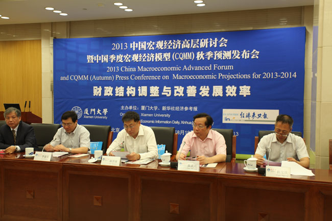 在这个名为“2013中国宏观经济高层研讨会暨‘中国季度宏观经济模型(CQMM)秋季预测发布会’”上,我校宏观经济研究中心和《经济参考报》发布《中国宏观经济预测与分析——2013秋季报告》,公布今明两年共六个季度的宏观经济主要指标的预测及相关政策模拟结果,并提出政策建议。