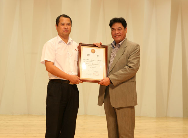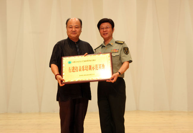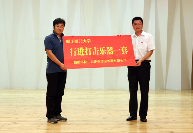 郑建国为厦门大学“行进打击乐培训示范基地”授牌,我校艺术学院院长苏力代表学校和学院接牌。中国乐器协会副主席、打击乐专业委员会会长、天津津宝乐器有限公司总经理刘运斌向我校捐赠一套行进打击乐器,校团委书记陈怀锋代表学校接受捐赠。