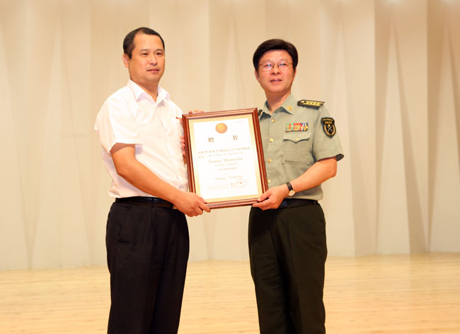 当天,学校敦聘中国音乐家协会打击乐学会会长、著名打击乐演奏家、教育家金纪广和中国打击乐学会副会长兼秘书长、中国行进打击乐联合会主席、中国人民解放军军乐团著名打击乐演奏家郑建国为我校兼职教授,校党委副书记林东伟向他们颁发聘书并佩戴校徽。