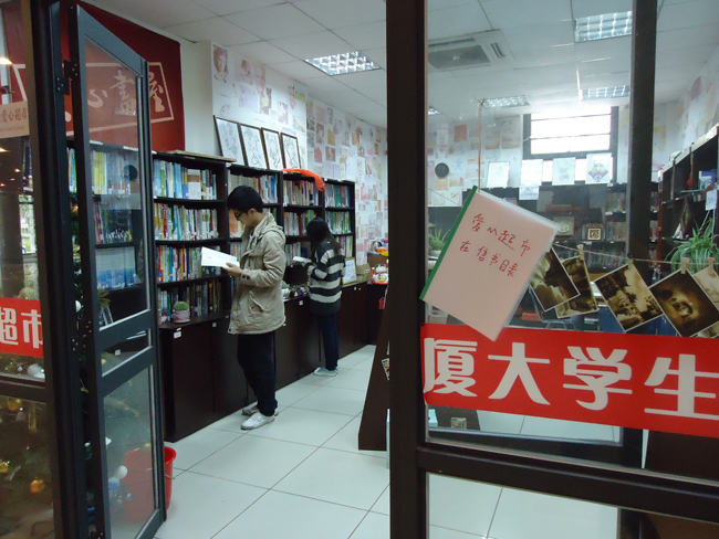 厦门大学爱心超市位于学生活动中心一楼,只有30平米不到的空间,摆放着各种二手教科书、教辅书、期刊杂志,是厦门大学最大的二手书实体交流平台。爱心超市创建于2007年,创建之初就怀着“让厦大二手书有个家”的理念,收集同学们捐赠的二手书,也帮助同学们寄卖二手书。每年到了毕业季,爱心超市的志愿者们都要到每个楼栋去“捡漏”,将毕业同学们不要的教材回收到书店来,按照类别整理上架,开学初的时候,再提供给需要的同学。有位毕业生曾经说:“离开厦大了,还有许多书带不走了,卖给废品回收,也就是几毛钱一斤。给了爱心超市,起码需要的学弟学妹们可以用上,有意义多了。”