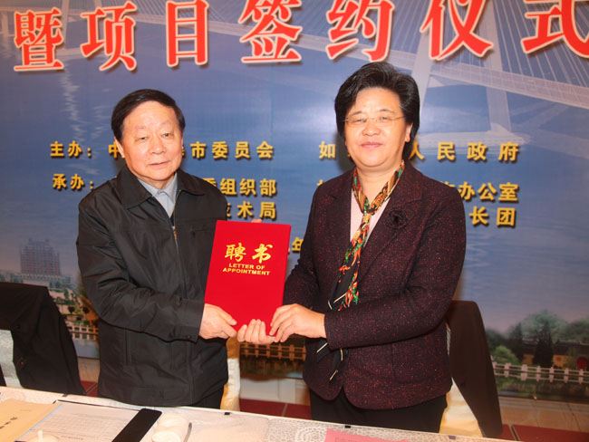 会上还同时举行了一批项目的签约和专家的聘任仪式。我校共有5名师生受聘,其中,万惠霖院士受聘为如皋市经济社会发展高级顾问(题图为如皋市委书记陈惠娟为万惠霖院士颁发聘书),化学化工学院周华博士受聘为如皋市科技人才工作特别顾问,化学化工学院副教授曹志凯、沙勇,化工系2011级博士生叶建初受聘为如皋市“教授博士柔性进企业活动”挂职人员。