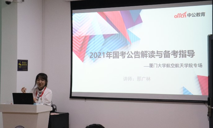 10月17日下午,在相同地点,我们邀请到中公教育福建厦门研究院讲师那广林为同学们开展考试公告解读及备考指导。那广林主要从“国考与选调生“、“国考选岗“、“各省选调生考情“、“备考指南”四个方面进行详细指导,通过深入浅出的讲解,让同学们更加深刻的了解选调生、国家公务员、事业单位考试的相关内容和情况,收获了备考相关技巧。她还耐心解答了同学们的各种疑问和困惑。