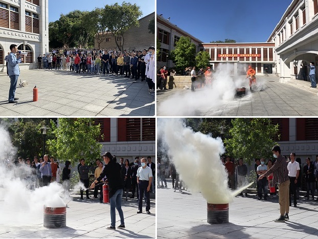 保卫处防火与交通安全管理科副科长孙俊逸为在场师生详细讲解了手持灭火器的使用知识,强调了灭火过程中的注意事项,并现场演示了灭火器和水带的正确使用方法。在场师生纷纷加入演习队伍,实际学习操作使用灭火器。