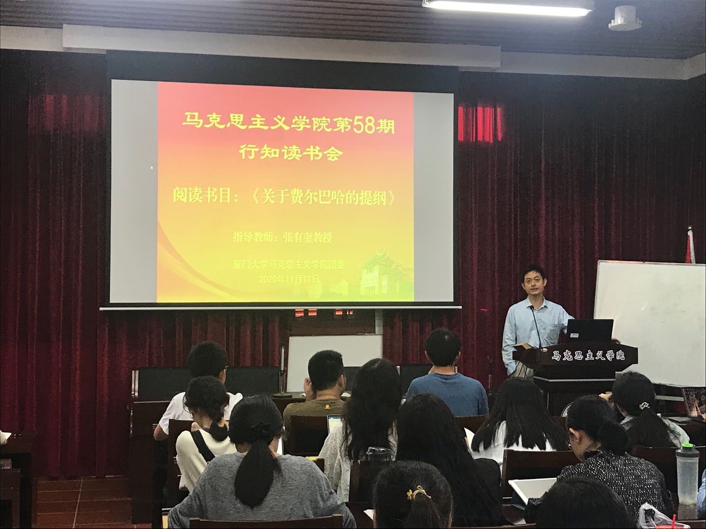 11月18日下午,马克思主义学院第58期行知读书会在同安楼举行。本次读书会研读的书目是包含着新世界观的天才萌芽的一个文件:《关于费尔巴哈的提纲》。此次读书会由我院张有奎老师担任指导教师,全体2020级硕士研究生参与了本次读书会。