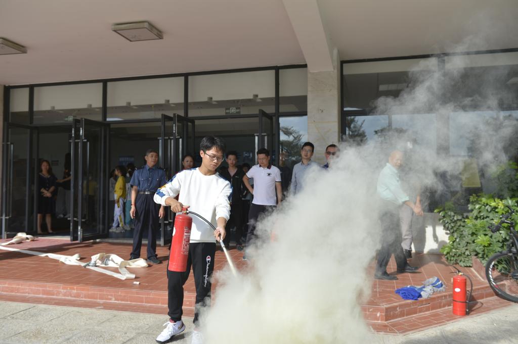 9:20分,全体人员各就各位,以工作人员释放烟雾弹,发出警报声为信号,开始分别从一楼比赛区和二楼观众区沿安全通道迅速有序撤离体育馆,前往体育馆外东门空旷地集中。随后,保卫处防火与交通安全管理科副科长孙俊逸对全体人员进行消防设备使用的现场培训和演练。在讲解和演示中,孙俊逸明确了四个简易使用灭火器步骤:提(罐)、拔(扣)、拉(管)、喷(粉),并进行了消防水带水枪安装接驳的演示。现场师生员工积极参与实操演练。