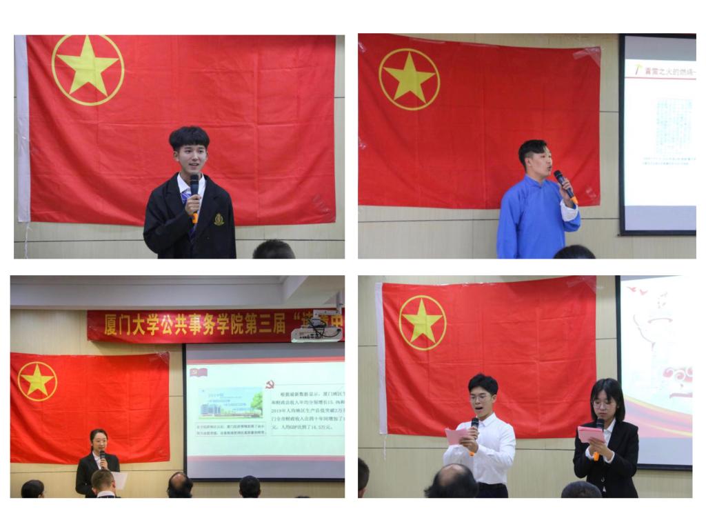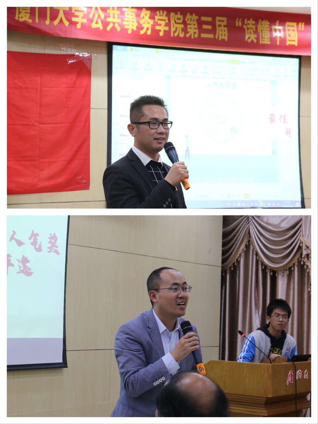 12月8日晚,公共事务学院第三届“读懂中国”征文演讲比赛在联兴楼举行。厦门大学团委副书记梁振伟、公共事务学院党委副书记林盛铨、信息学院团委书记唐腾凤、数学科学学院团委书记于正伟、公共事务学院团委书记徐莹、公共事务学院辅导员李思颖、张祯祯出席本次活动。