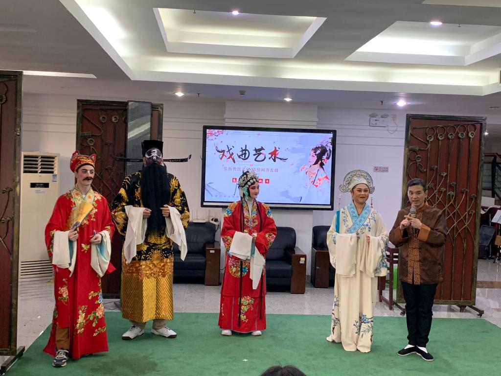 参观完嘉庚建筑后,师生一行人来到厦门市金莲升高甲剧团,受到了剧团老师们的热烈欢迎。老师们表演了《群芳争艳》《班头爷》《五步送哥》《三千两金》等经典剧目。中外学子们积极参与戏曲装扮和动作表演,在深入的学习和体验中领略闽南传统文化的魅力。