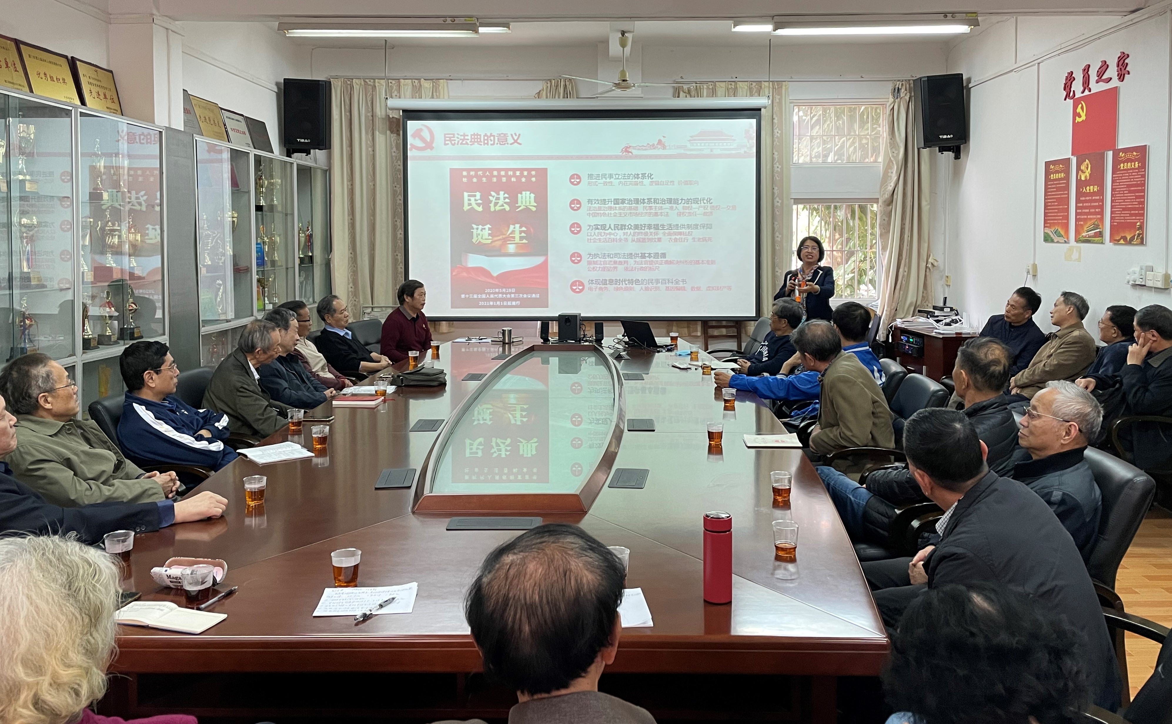 何丽新为离退休党支部书记详细解读《民法典》,她简要介绍民法典出台情况,阐述了民法典推进民事立法的体系化、有效提升国家治理体系和治理能力的现代化、为实现人民群众美好幸福生活提供制度保障、为执法和司法提供基本遵循、体现信息时代特色的民事百科全书等五个方面的重大意义。紧接着,她紧紧围绕“学习贯彻习近平总书记关于民法典的重要论述,民法典彰显中国特色、时代特色、实践特色,民法典体现制度创新、保障人民美好生活实现,以实施《民法典》为抓手、全面推进法治政府建设”等四个方面展开论述,进行了深入浅出的精彩解读。