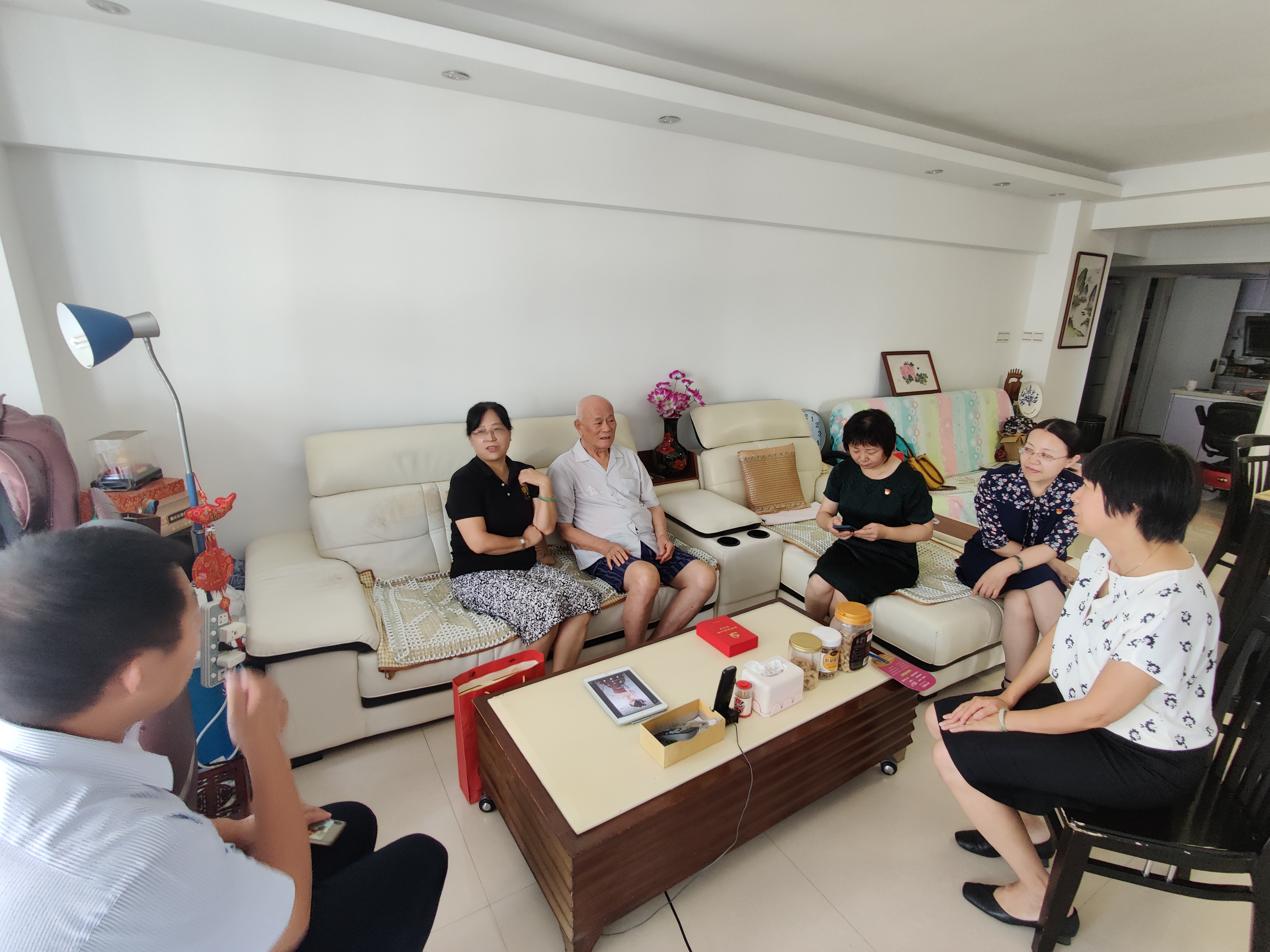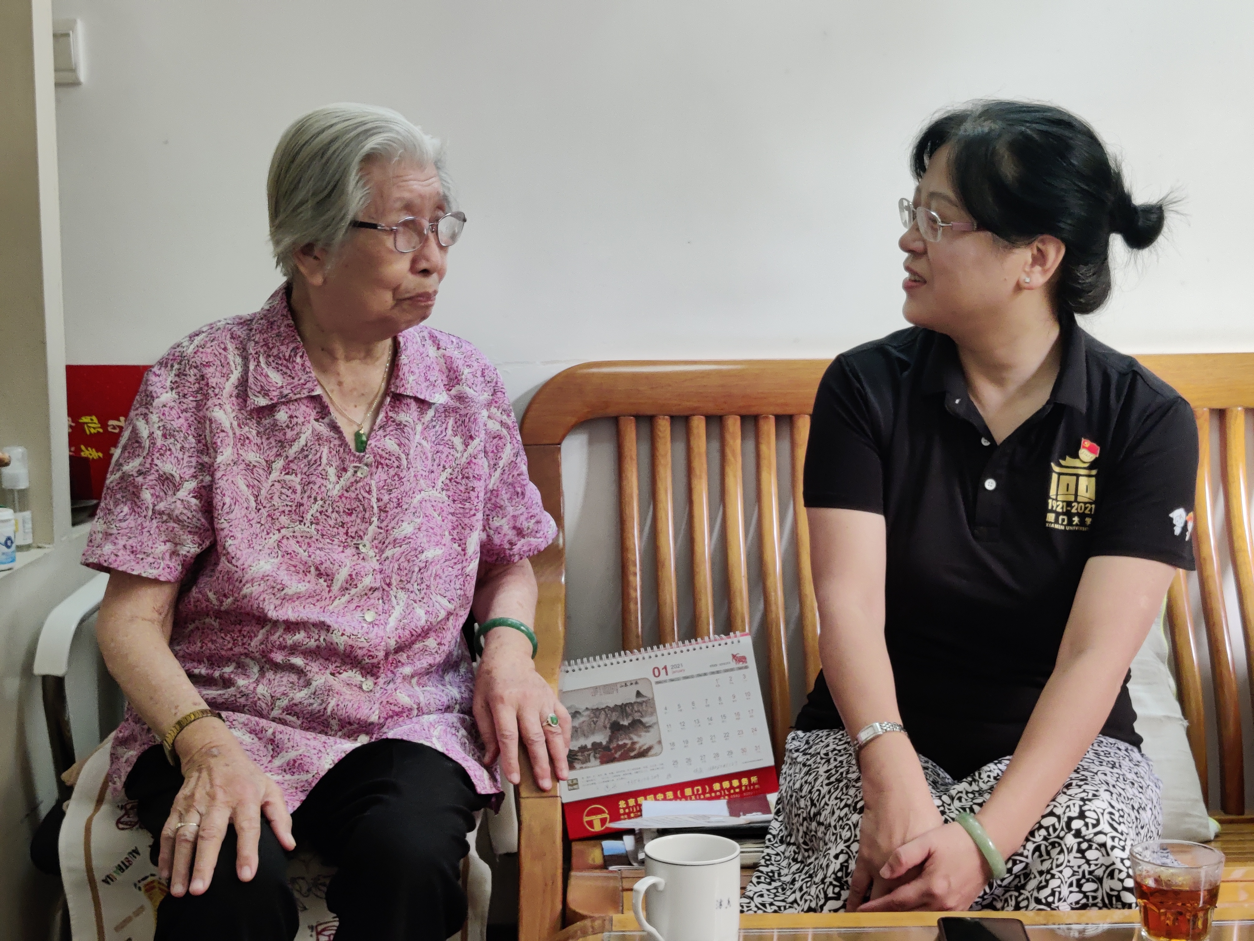 在两位老同志家中,陈志伟与两位老党员促膝交谈,关切询问日常生活和身体健康状况,邀请两位老同志讲述他们个人的革命历史,共同回顾我们党的百年光辉历程。曾淑萍回顾了在菲律宾期间的革命经历以及回国后参加社会主义建设的光荣历史。曾老师自小学时就通过身边的进步人士、文学作品接触到马克思主义思想。1942年,年仅14岁的她即投身革命,1944年正式加入菲律宾共产党。曾老师在菲积极投身抗日爱国一线工作和抗战胜利后党的地下活动。1958年回国后,积极参与党的侨务、高等教育等工作,为厦门大学、华侨大学英语专业建设作出了卓越贡献。连淑能着重介绍了驻外期间和建院期间的历史。连老师1966年入党,在我校毕业后留校任教,七十年代外派圭亚那驻外,八十年代着手人工语言与机器翻译的前沿科研项目,面对IBM公司和纽约州立大学的诱人邀请,他毅然选择回国继续完成由其承担的国家863计划机器翻译研究并取得了优秀成果。九十年代,他应邀赴英国牛津大学及剑桥大学作高级访问学者,形成长篇考察报告《牛津剑桥之谜》上报教育部,应邀到全国各大高校做了200多场报告。1999年,我校进行校内管理体制改革,组建外文学院,连老师担任首任院长。