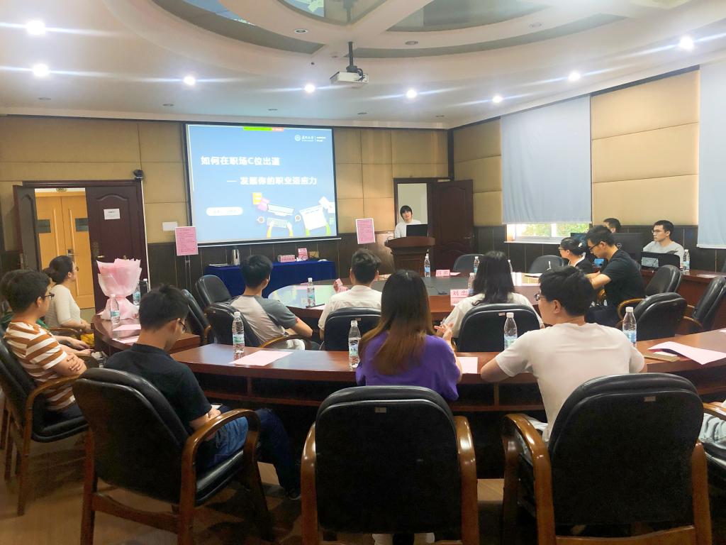 2020届的四位毕业生代表,博士生张杰,硕士生刘恋、徐滨滨、朱林辉分别介绍了自己的求职、就业经验。内容涵盖了平时学习、科研和生活的管理、求职信息获取途径、求职能力培养、简历制作、笔试面试准备、选调生备考等内容,特别是求职心路历程的分享,赢得了在场许多同学的共鸣。