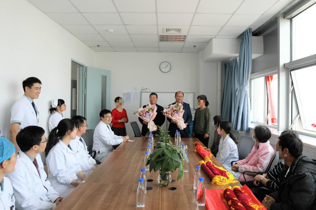 经过医护团队近1个月的不懈努力,首批两位肾移植患者即将康复出院,为庆祝这意义非凡的时刻, 1月7日,厦大翔安医院泌尿外科首批肾移植患者答谢会在住院部8楼泌尿外科医生办公室隆重举行。会上,附属翔安医院党委书记吴立武、执行院长张国君教授,泌尿外科主任、肾移植负责人邵晨教授分别感谢并表扬了肾移植团队及相关科室部门在移植筹备及建设中密切配合,高效安全的作风及无惧艰辛、勇往直前的精神,并祝福首批肾移植患者顺利出院、新春快乐、生活美满,早日回归社会。同时,患者代表汪先生及患者家属代表许女士分别对肾移植相关科室部门领导、工作人员致以崇高的敬意和衷心的感谢,感谢医护团队如家人般无微不至的照料。患者及家属向吴书记、张院长献花以表感激之情,向肾移植相关工作人员送上锦旗并合影留念。