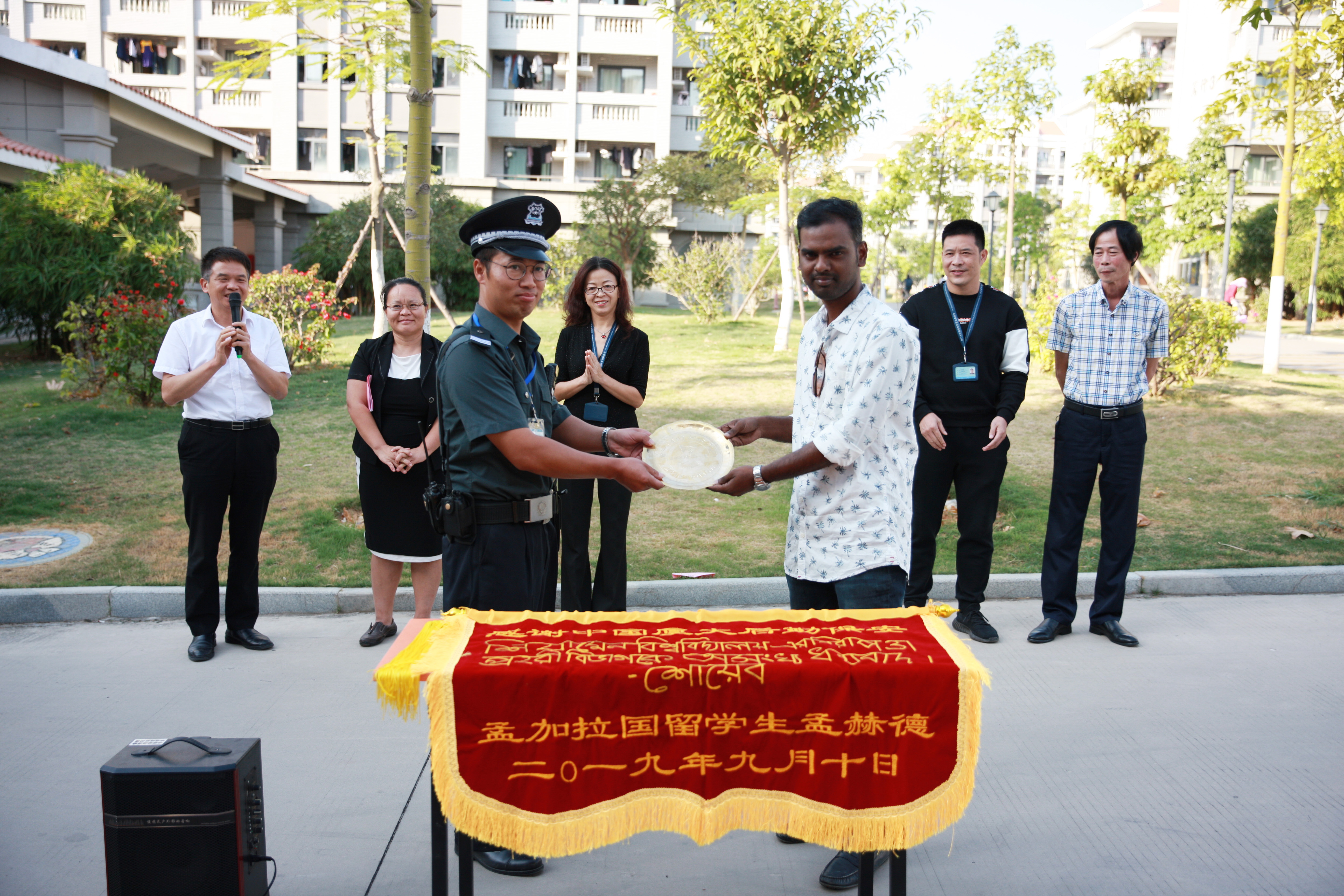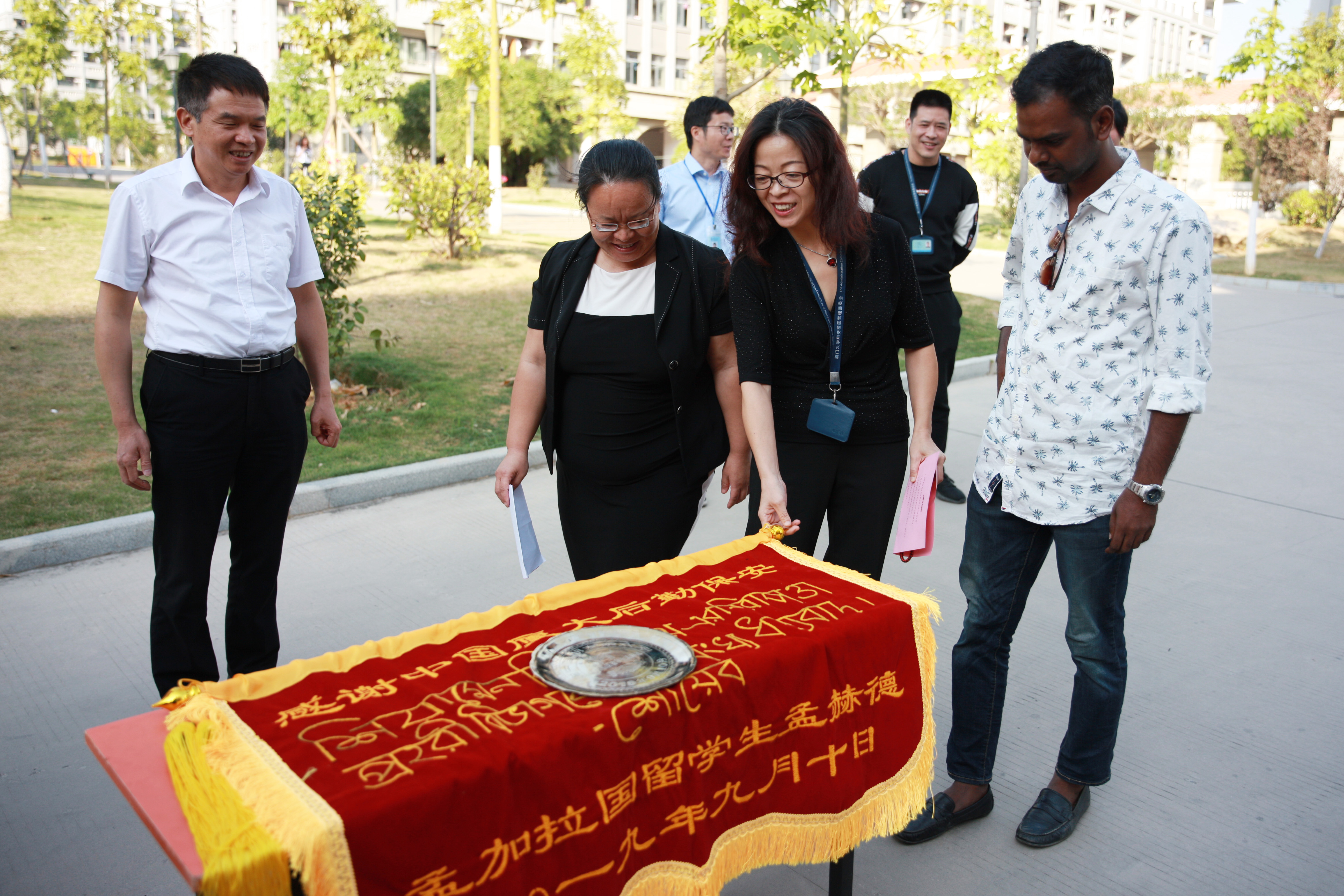 11月5日下午,秋高气爽,天朗风清,一枚刻着“赠中国朋友余永刚”字样的孟加拉国锡盘和一面精致的手工绣字的红色锦旗,安静的放置在翔安校区国际学生住宿园区笃行6楼前的桌面上。